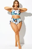 Plus Size Round Neck Black Patchwork Bikini Top