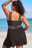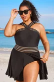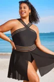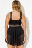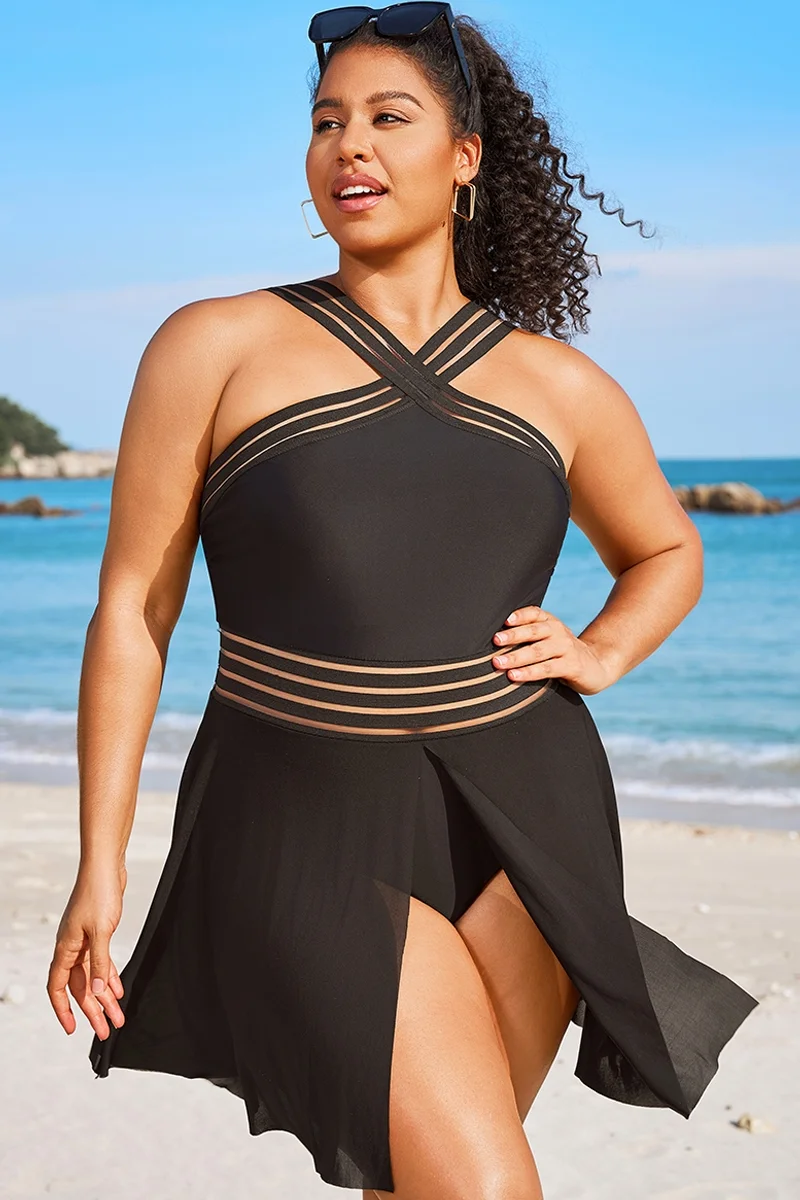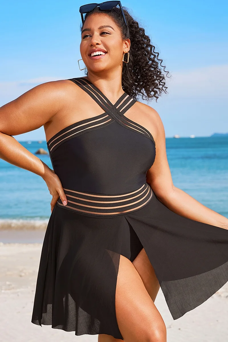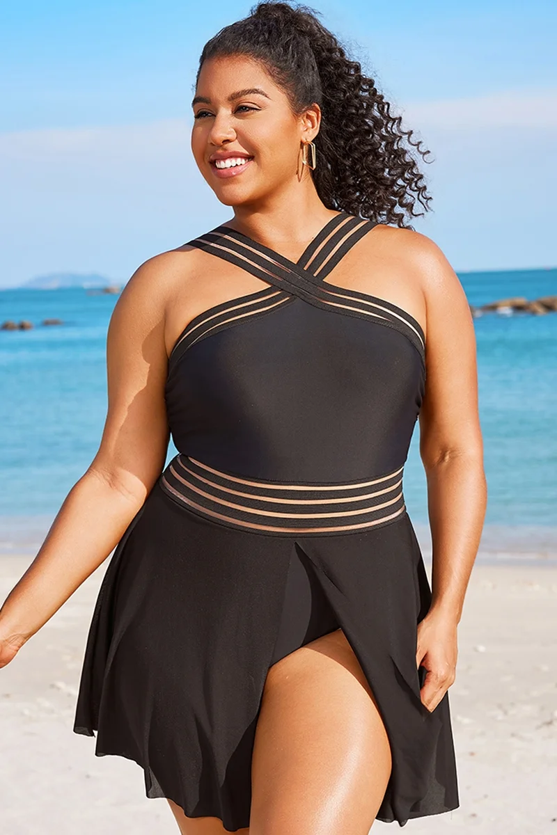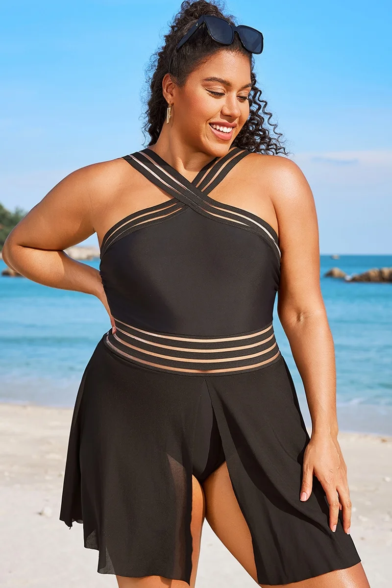 Plus Size Round Neck Black Patchwork Bikini Top
