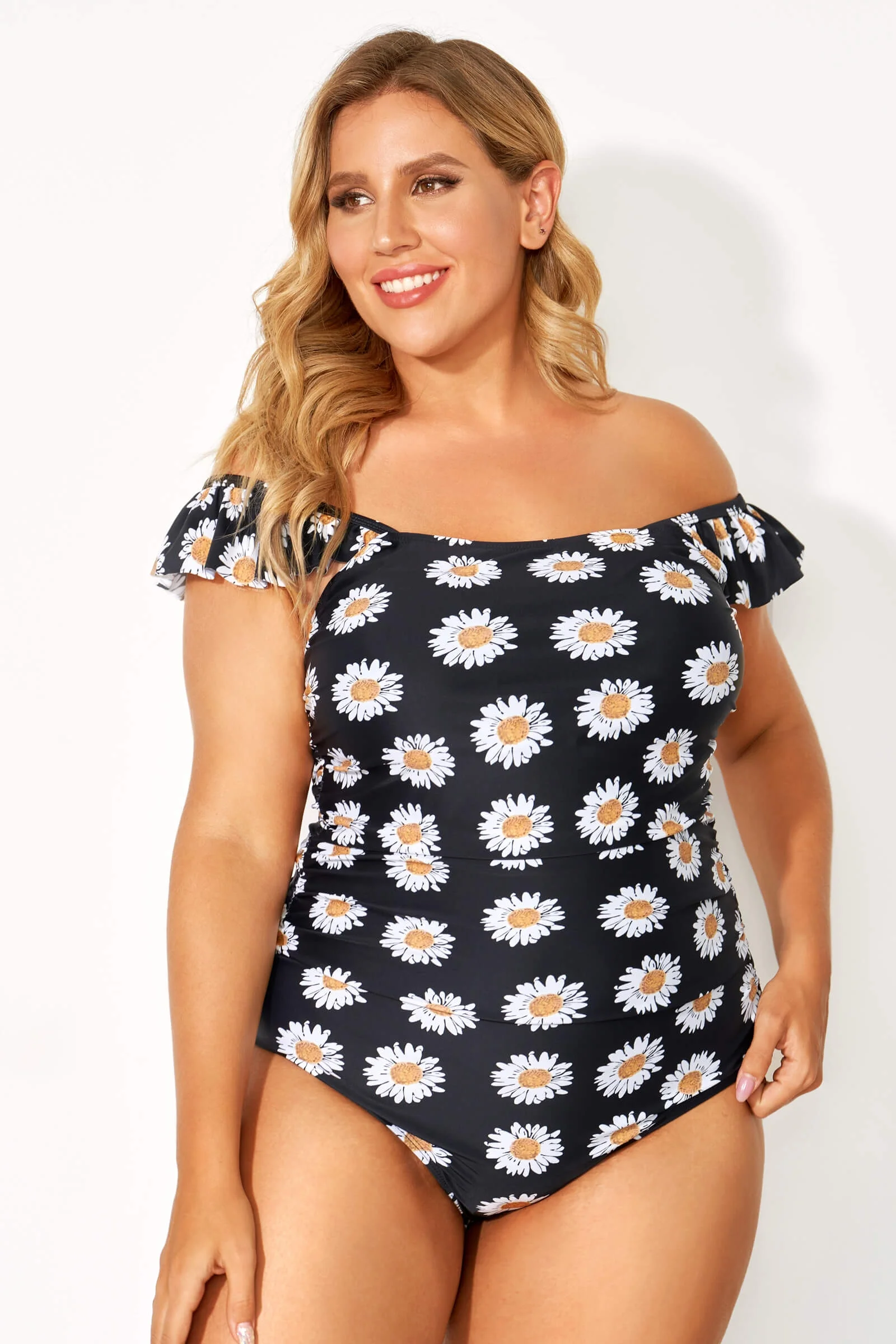 Black Daisy Printed Flutter Sleeves One Piece Swimsuit - PremCurve