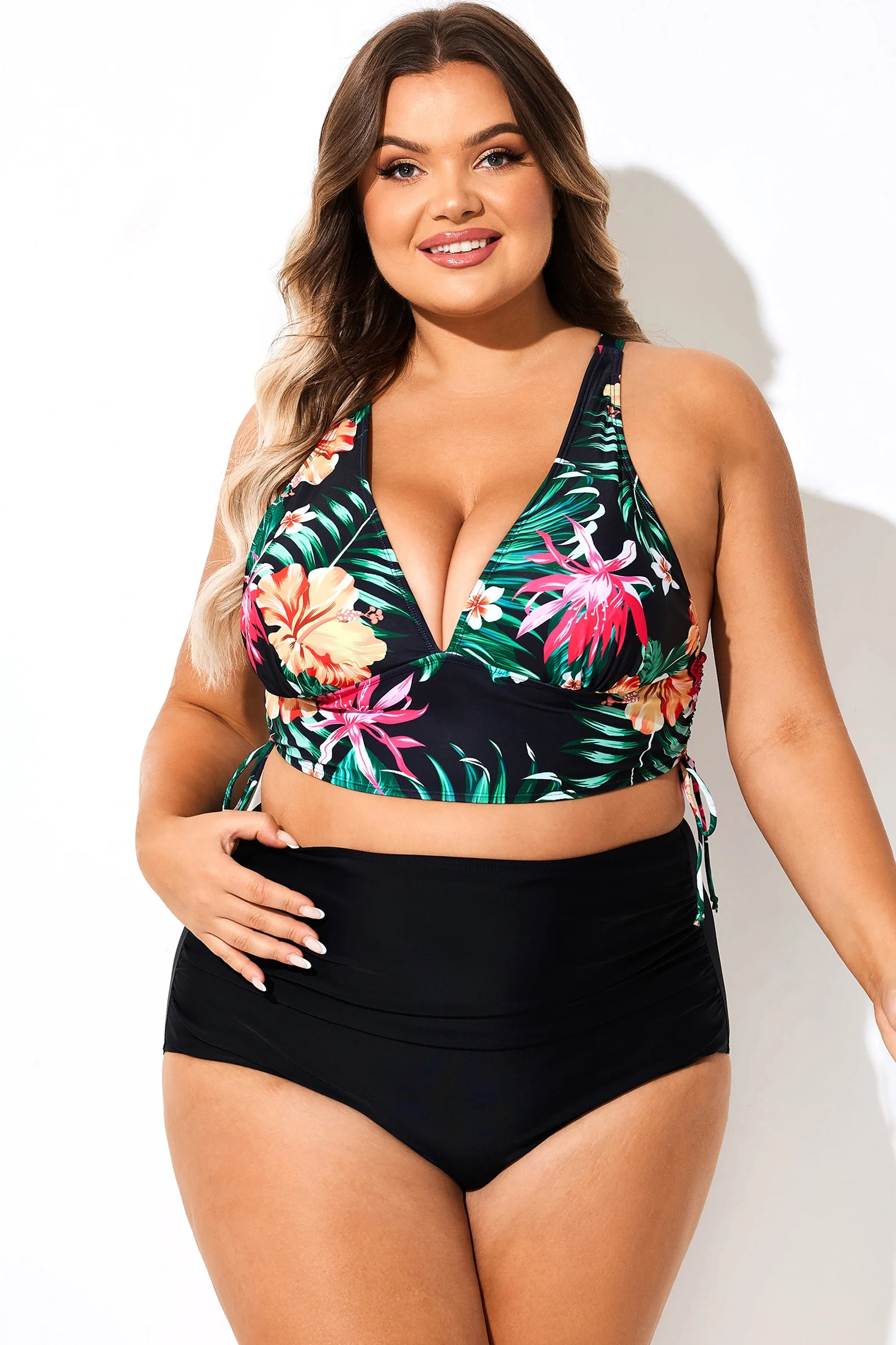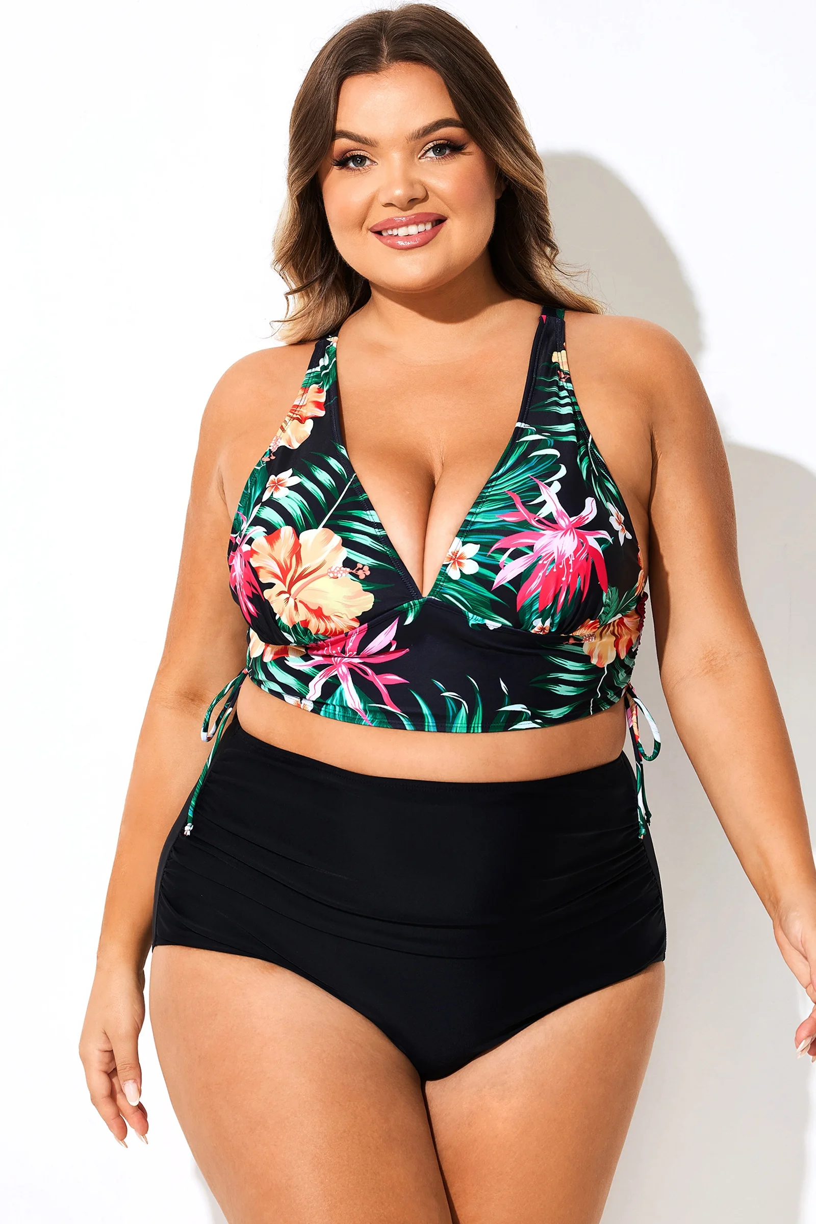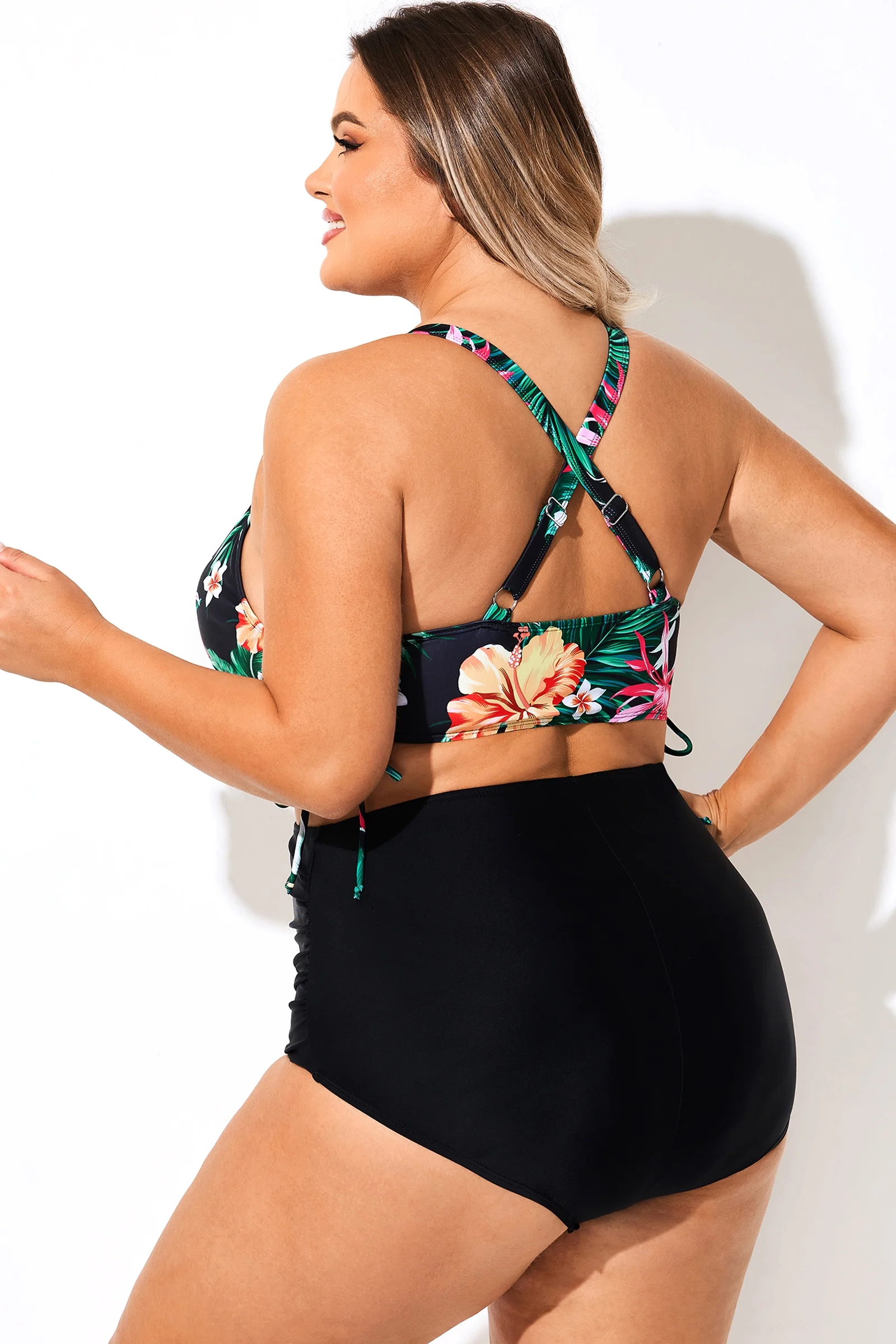 Black Floral Drawstring Ruched Crossback Bikini Top - PremCurve