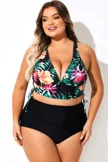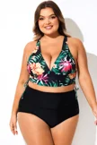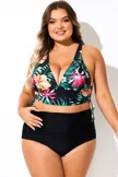 Plus Size Round Neck Black Patchwork Bikini Top