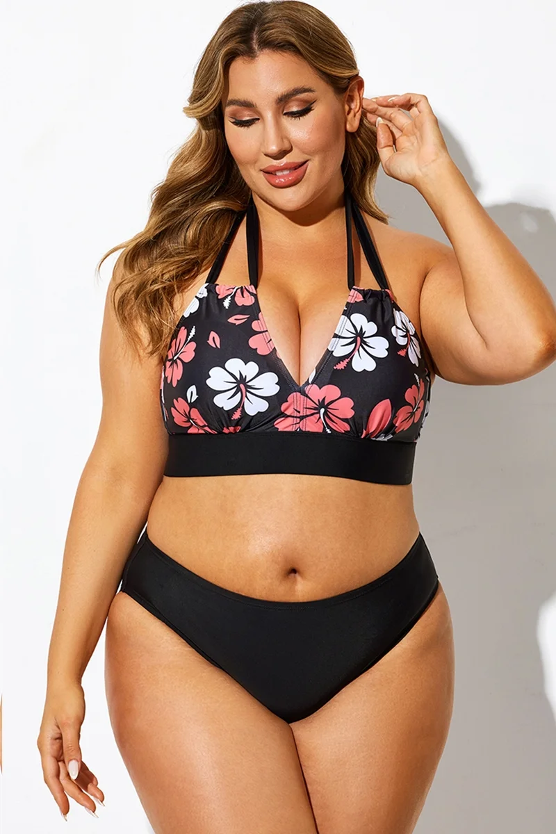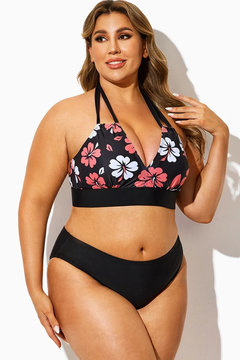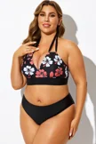 Black Floral Print Halter Sexy Bikini Top