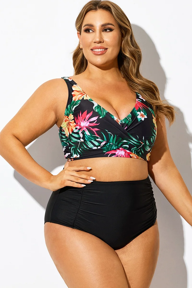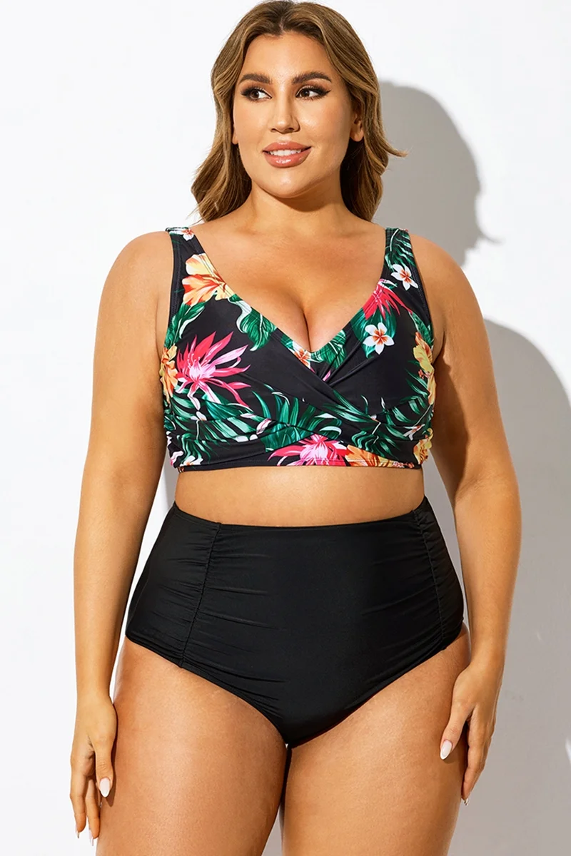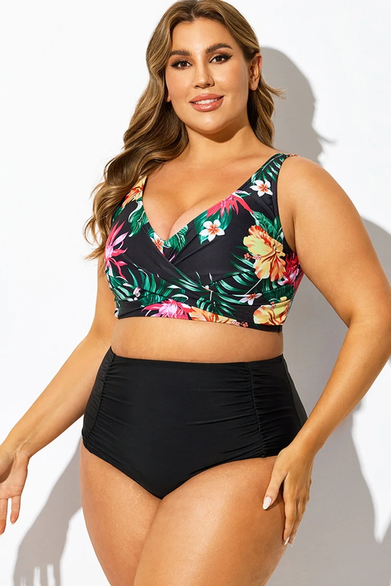 Plus Size Round Neck Black Patchwork Bikini Top