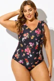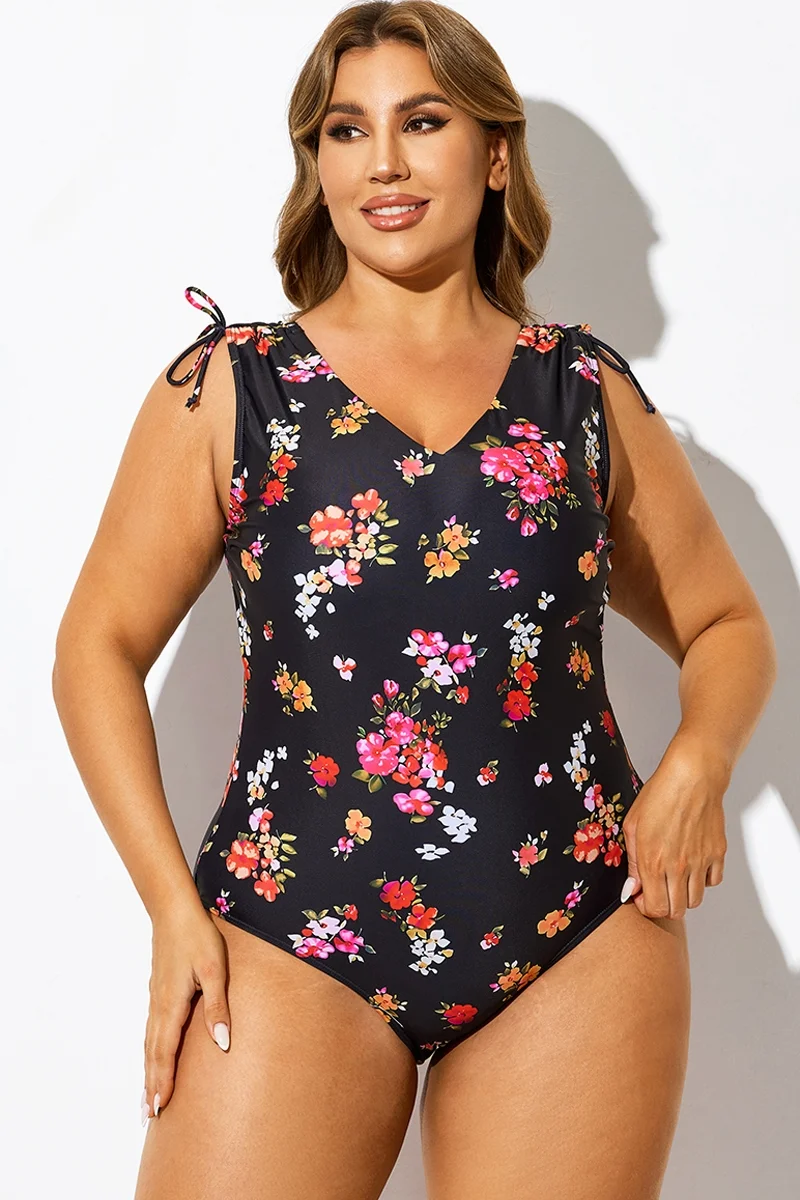 Black Floral Print V-Neck One Piece Swimsuit