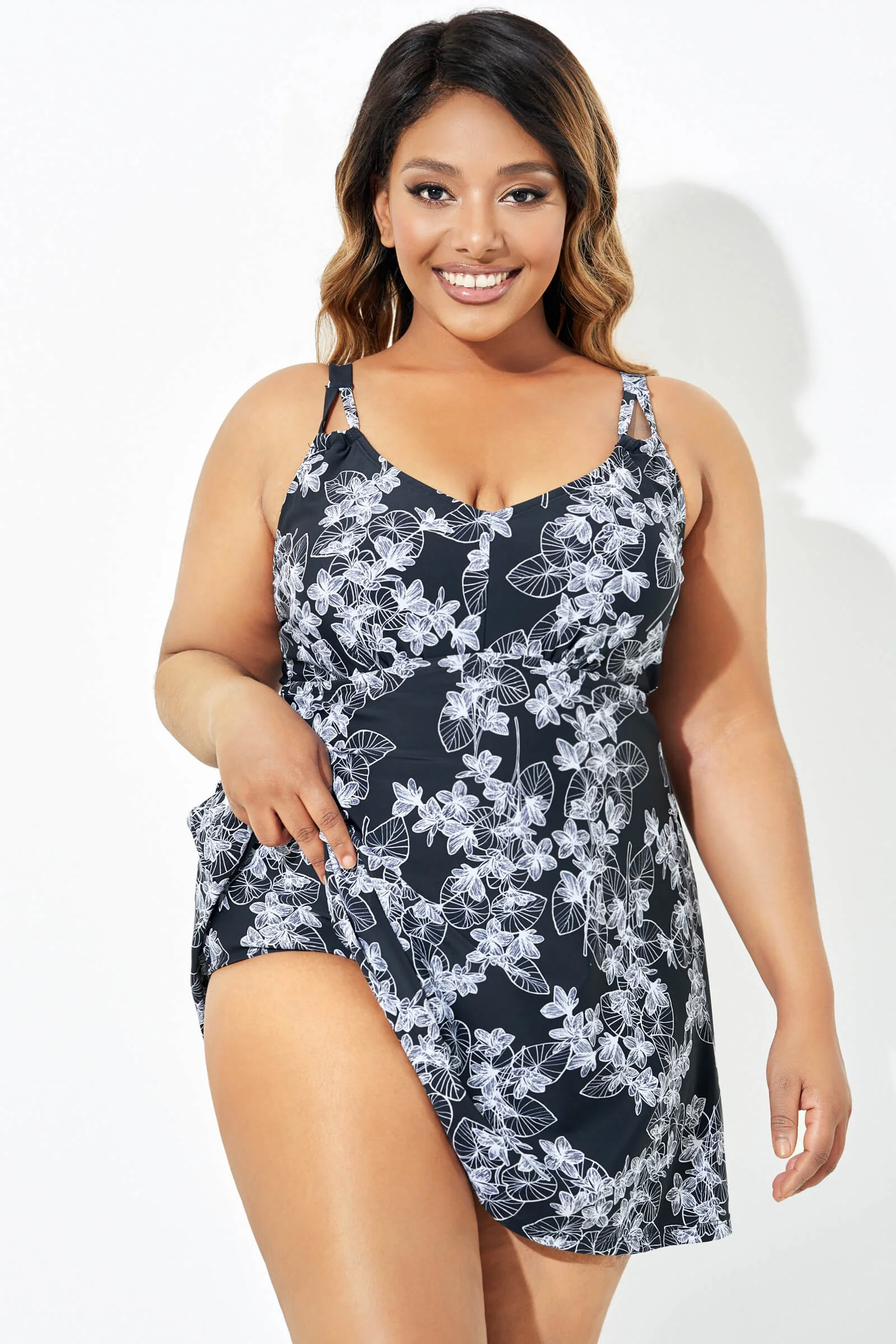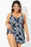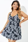 Black Floral Printed Double Strap Women Swimdress
