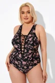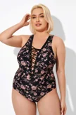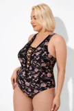 Black Floral Printed Lace Up One Piece Swimsuit