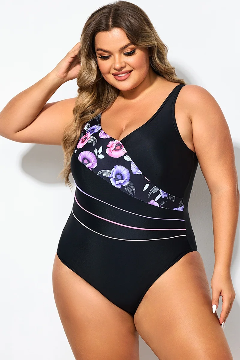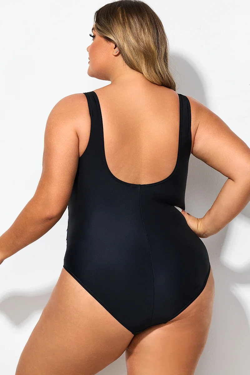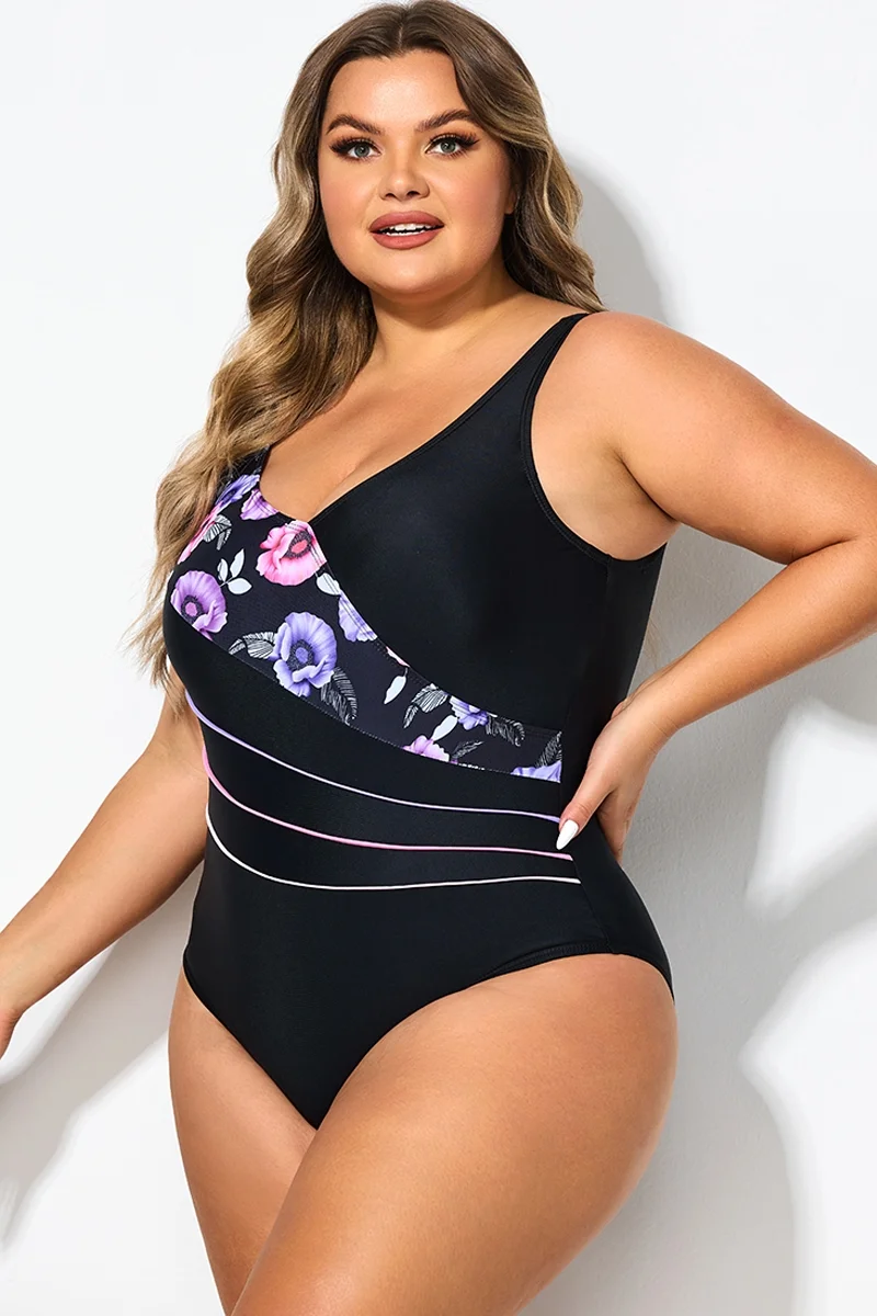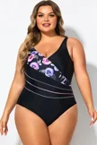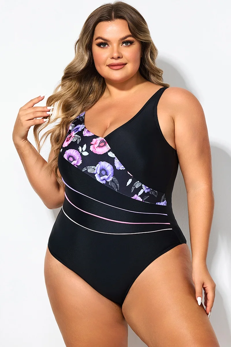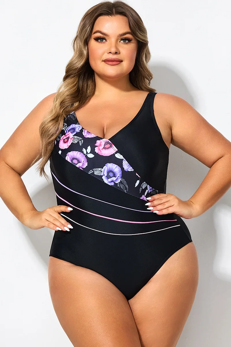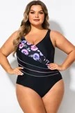 Black Flower Printed Women One Piece Swimsuit - PremCurve