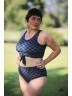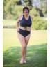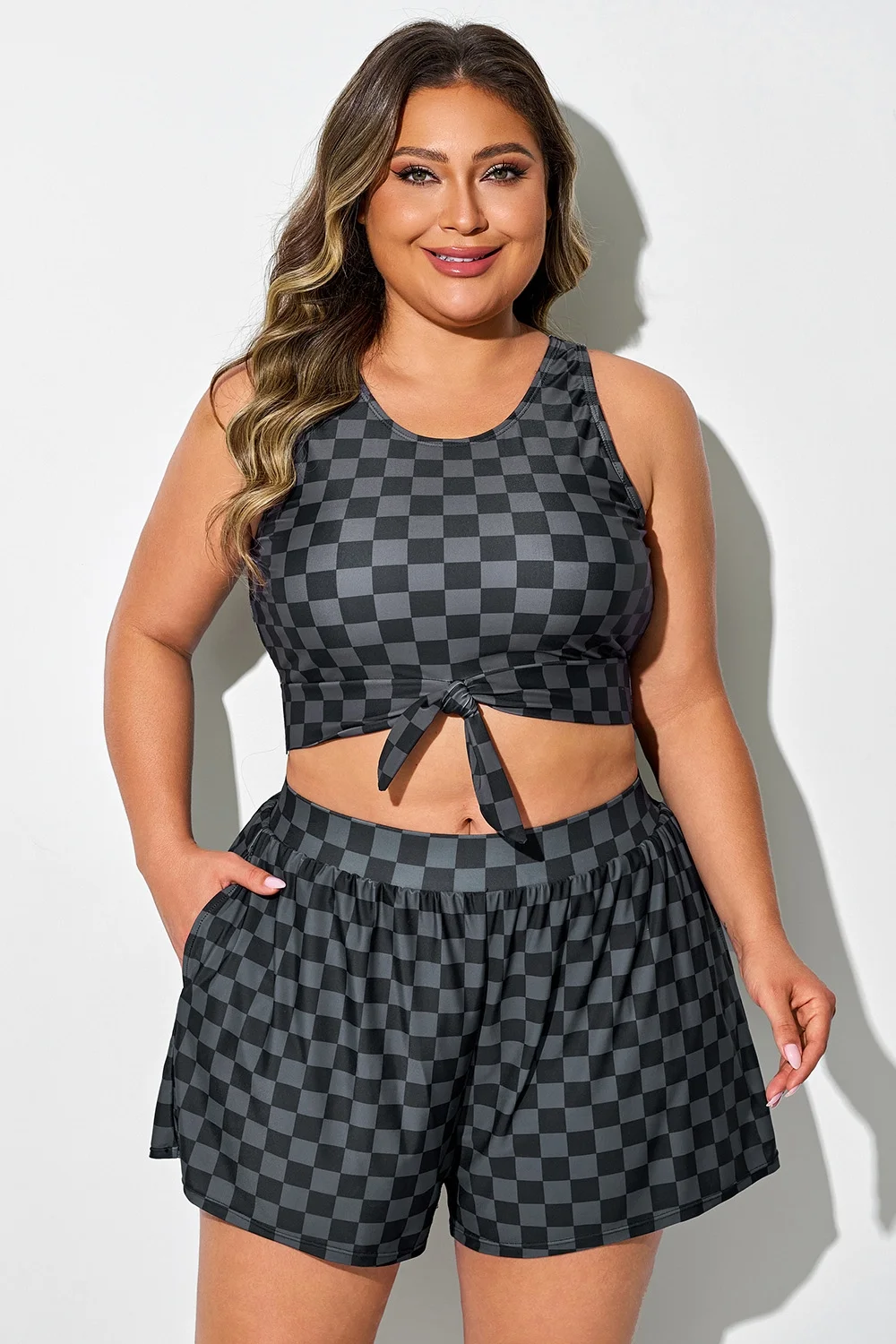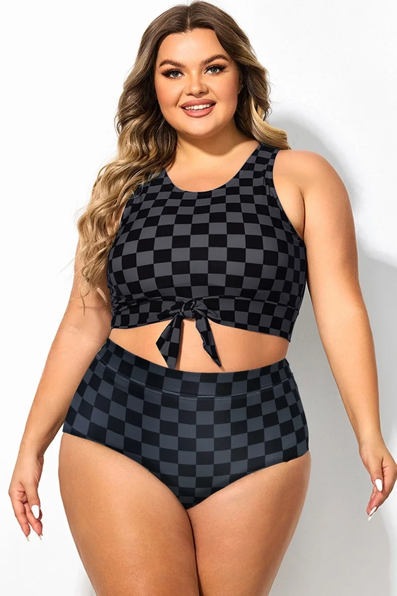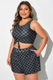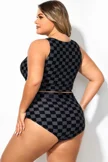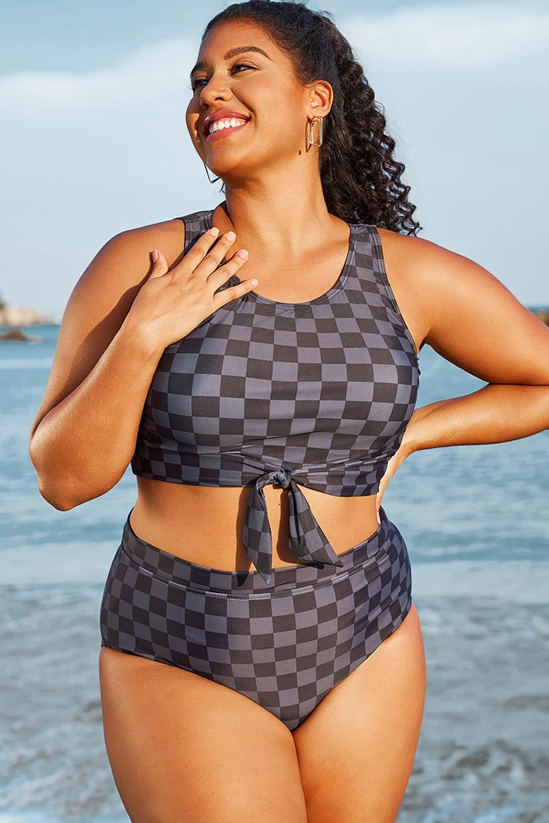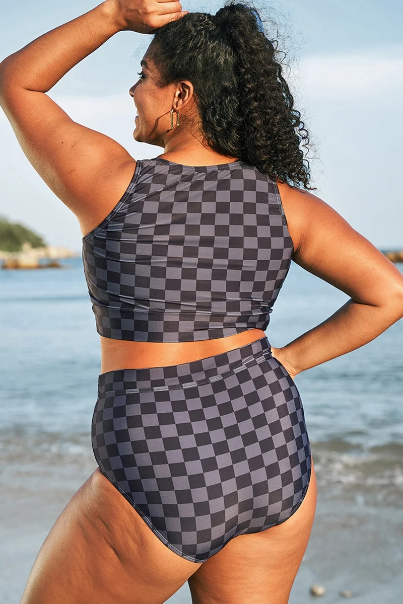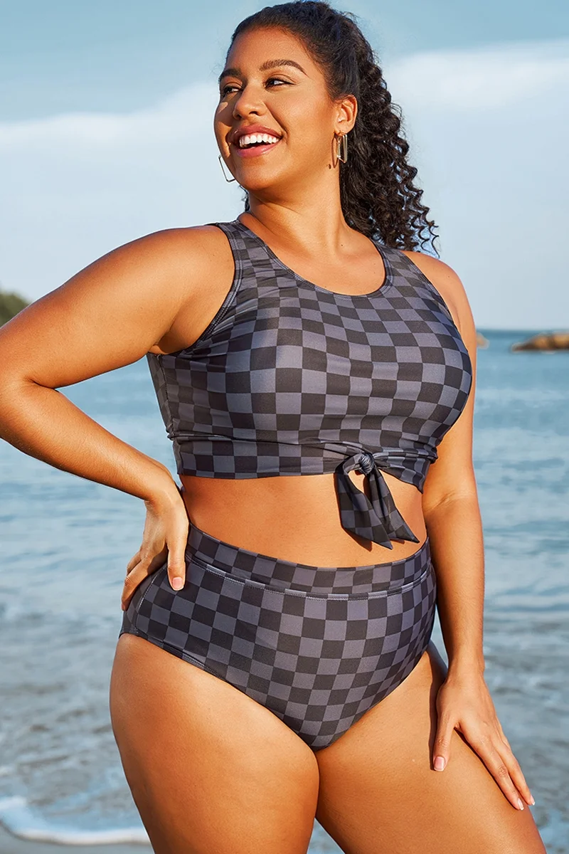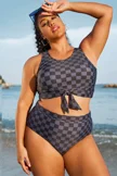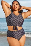 The crop style is trendy and provides a bit more coverage than traditional bikini tops. The tummy control feature subtly smooths the midsection. The black and grey check pattern is chic and versatile.Briar McDonald1 -