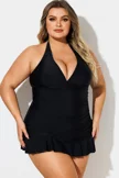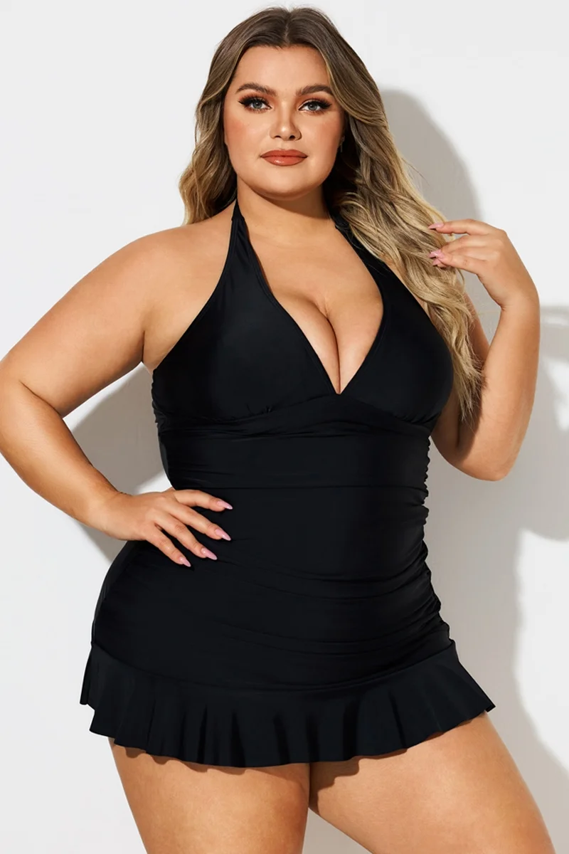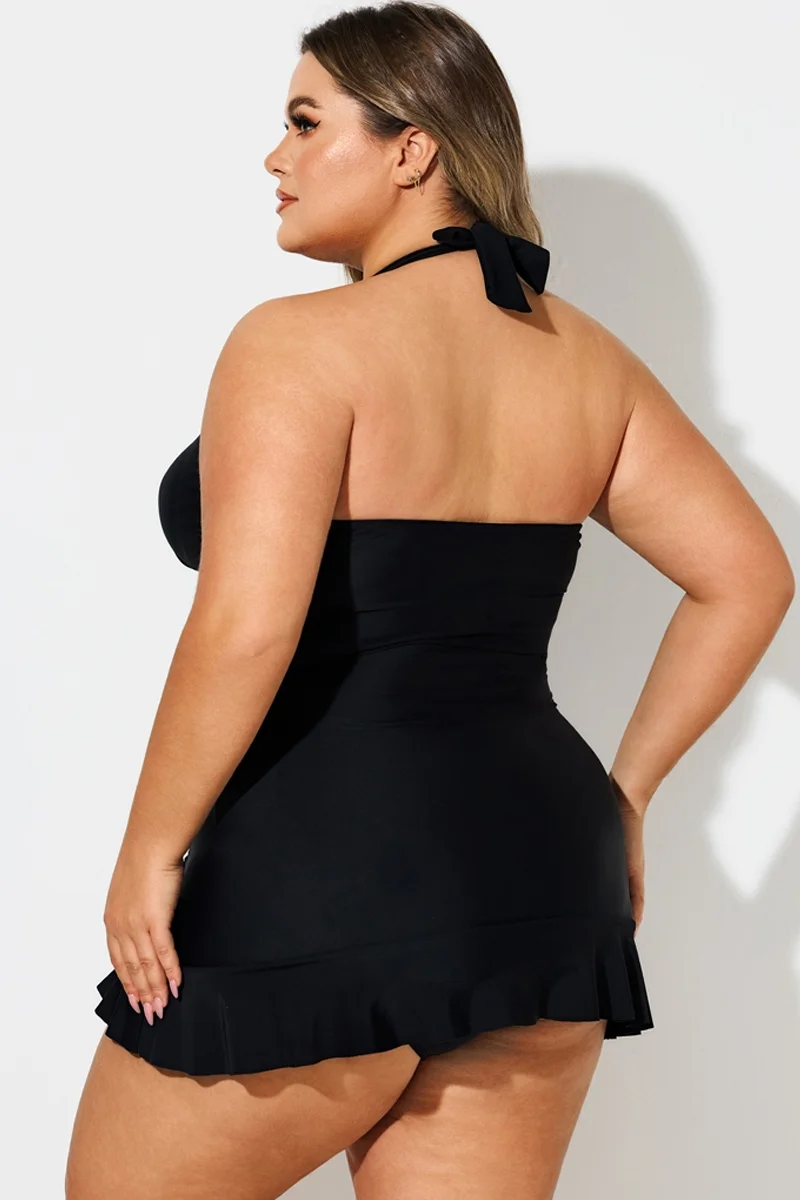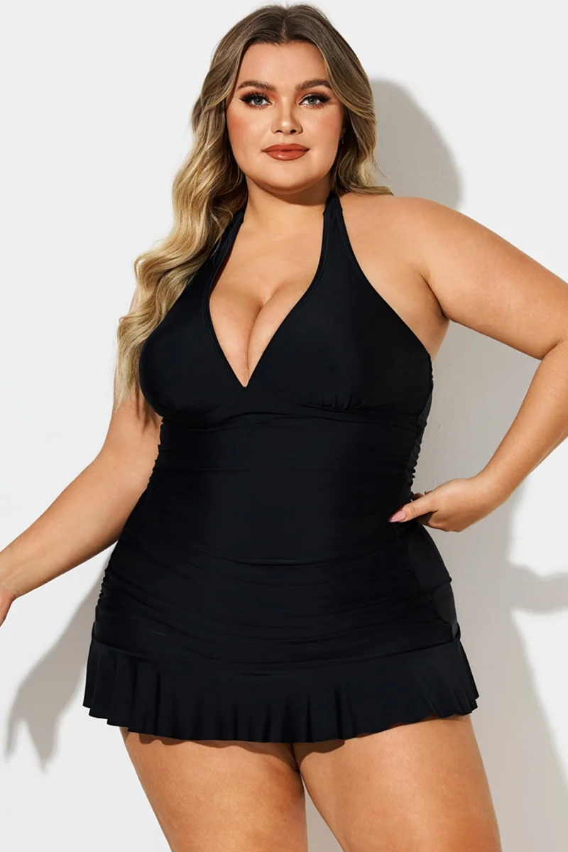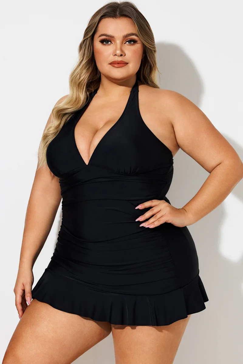 Black Halter Neck Ruched Tummy Control Swimdress - PremCurve