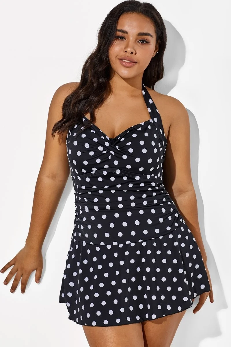 Black Halter Sweetheart Polka Dot Sexy Swimdress - PremCurve