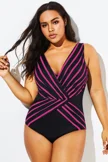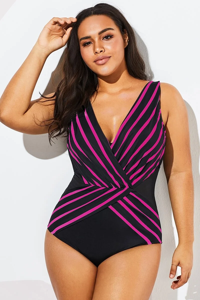 Black & Pink V-Neck Streak Casual One Piece Swimsuit - PremCurve
