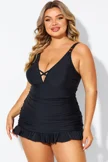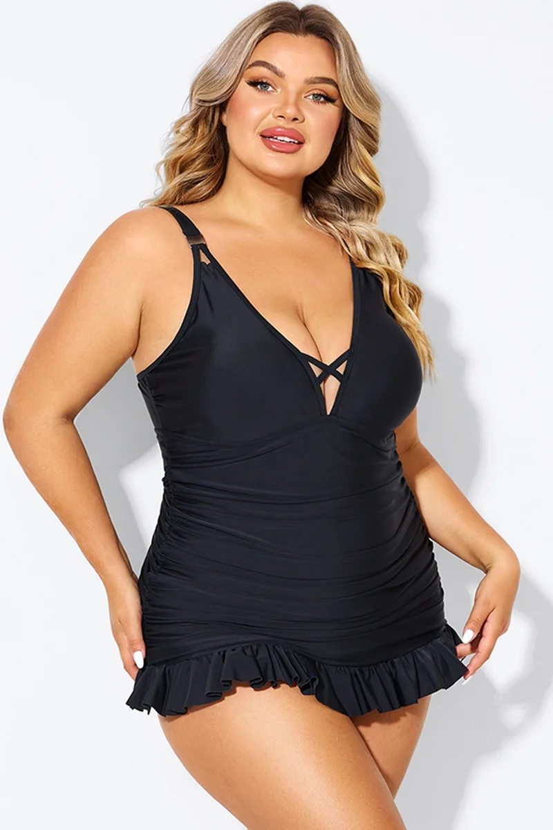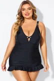 Plus Size Round Neck Black Patchwork Bikini Top