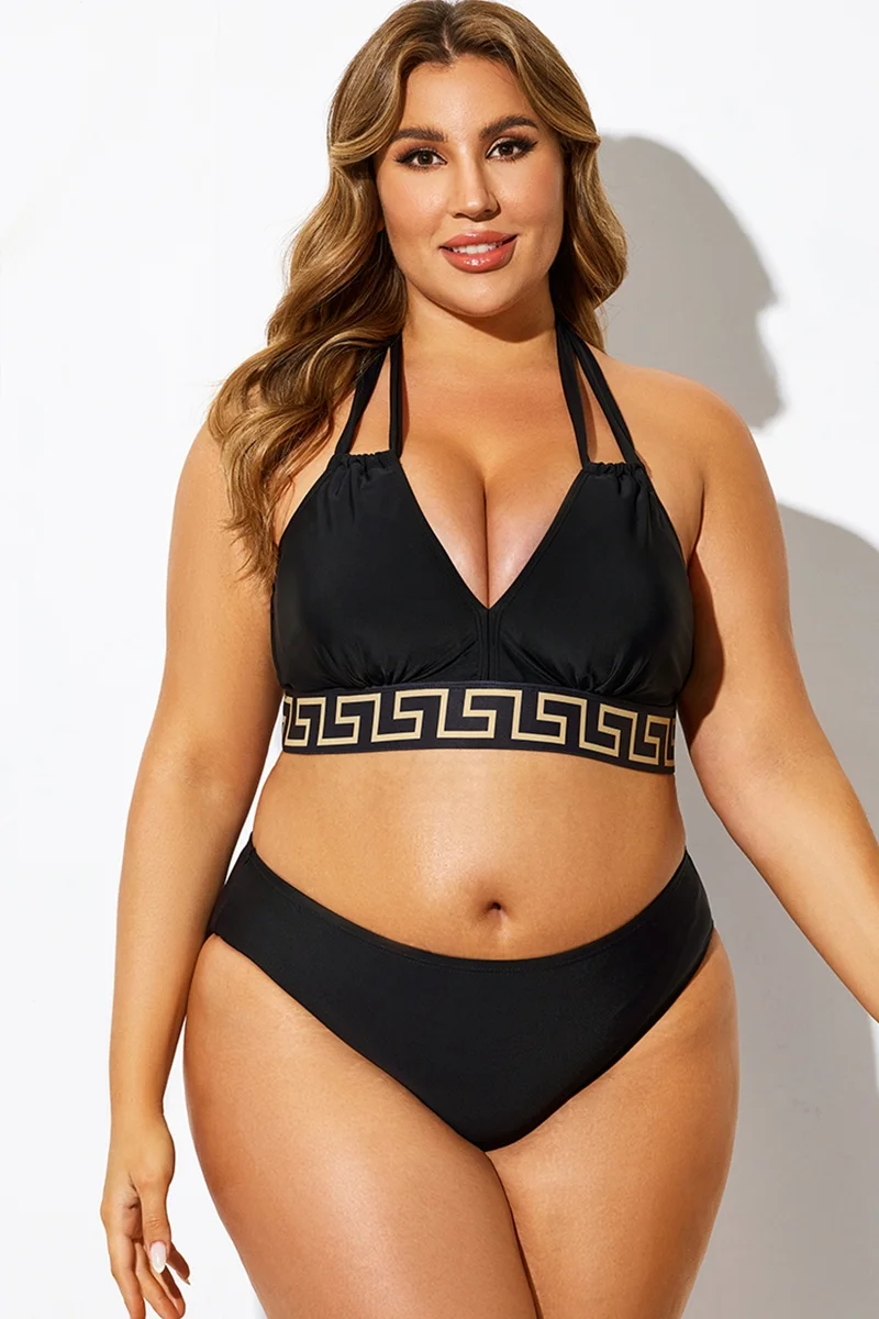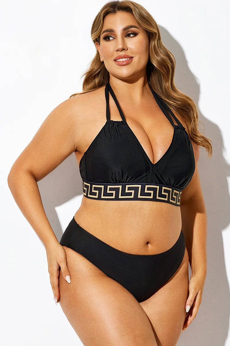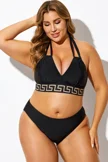 Plus Size Round Neck Black Patchwork Bikini Top