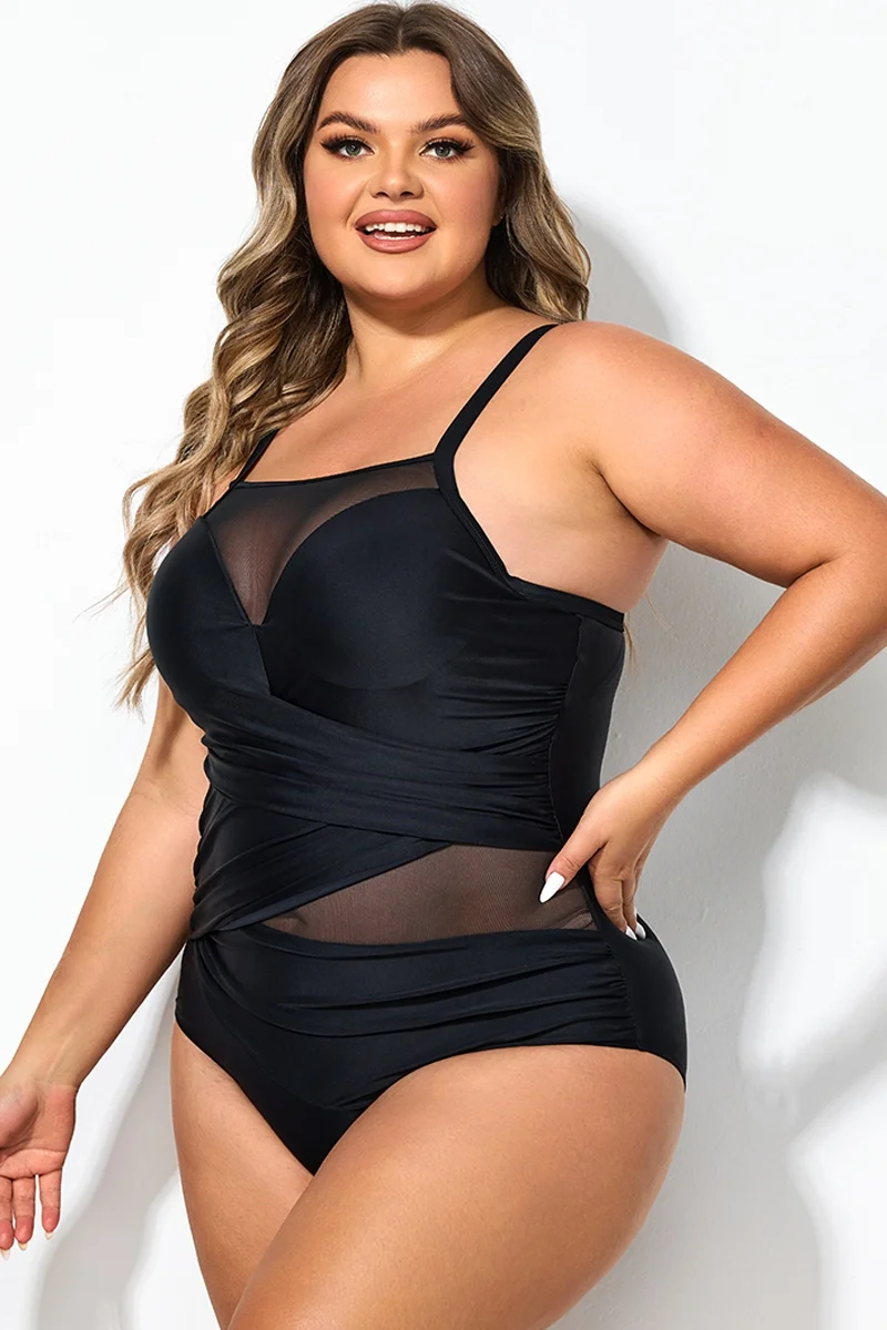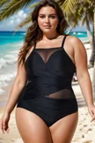 Black Round Neck Adjustable Straps One Piece Swimsuit