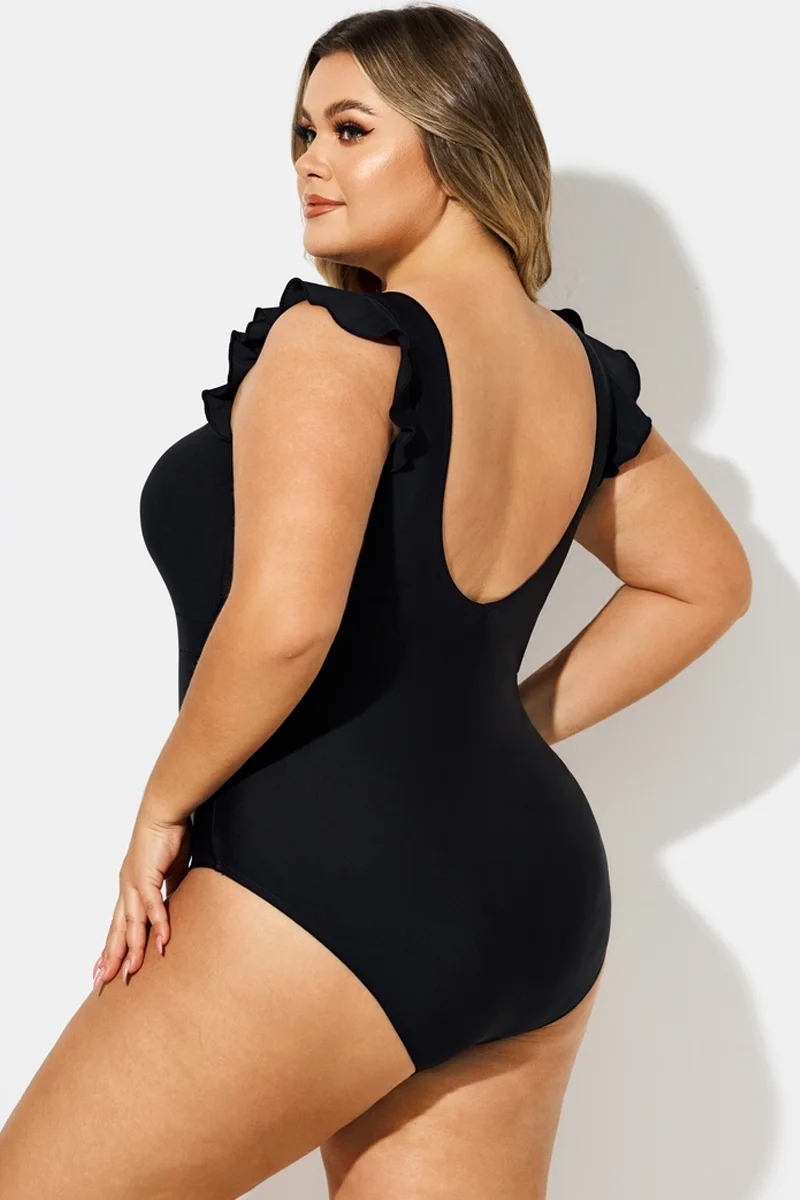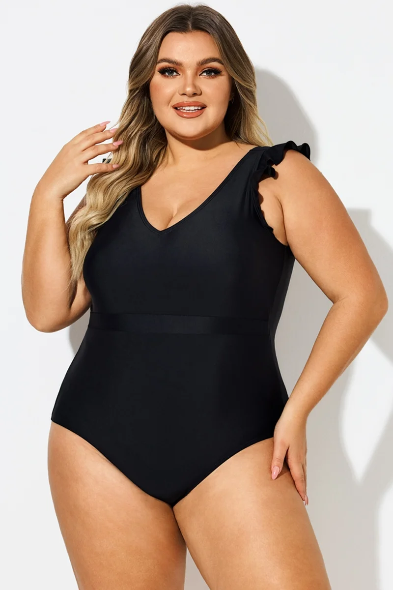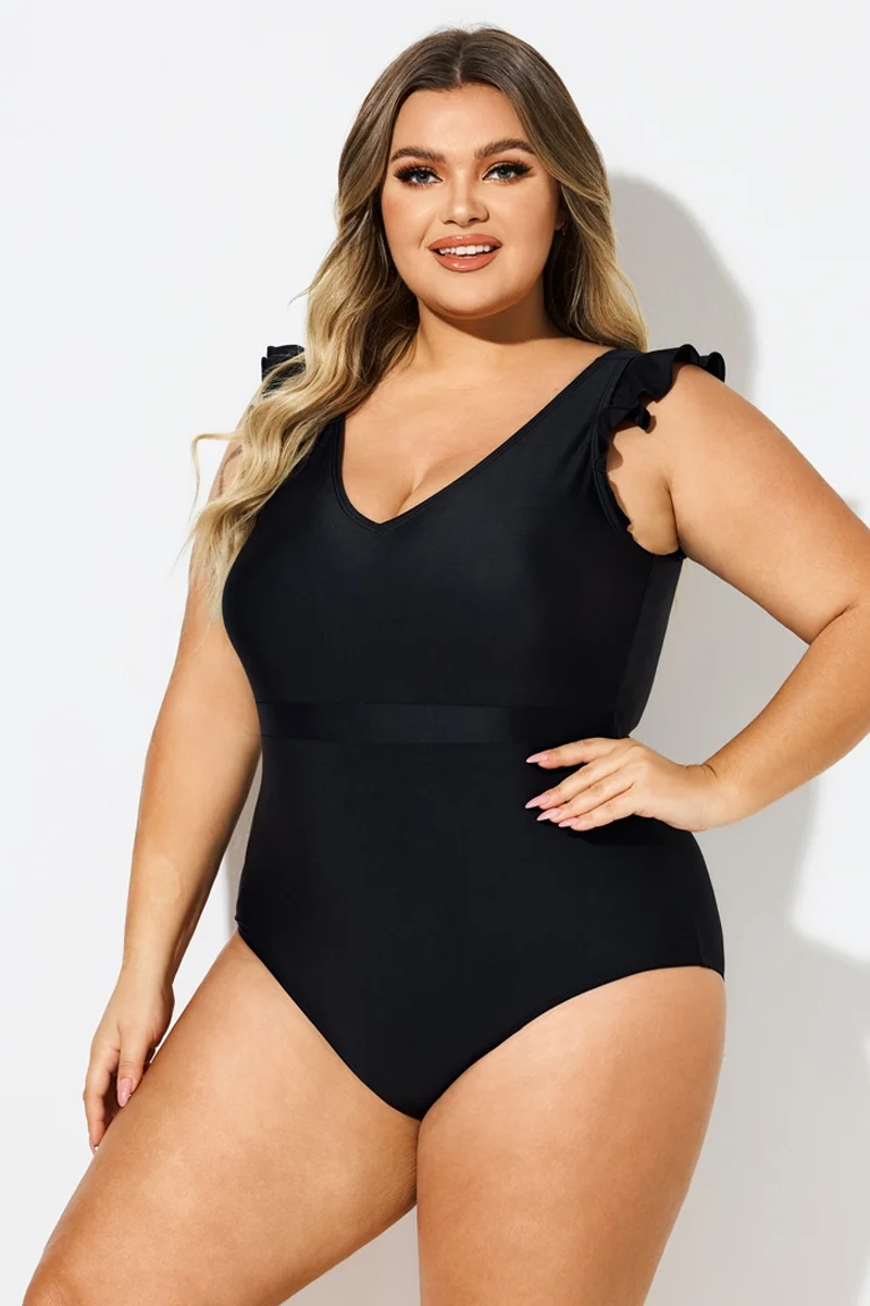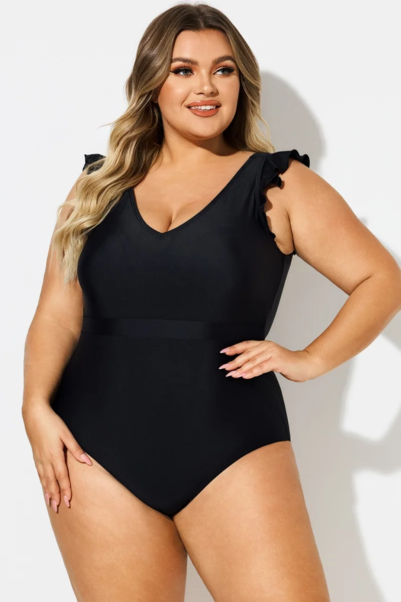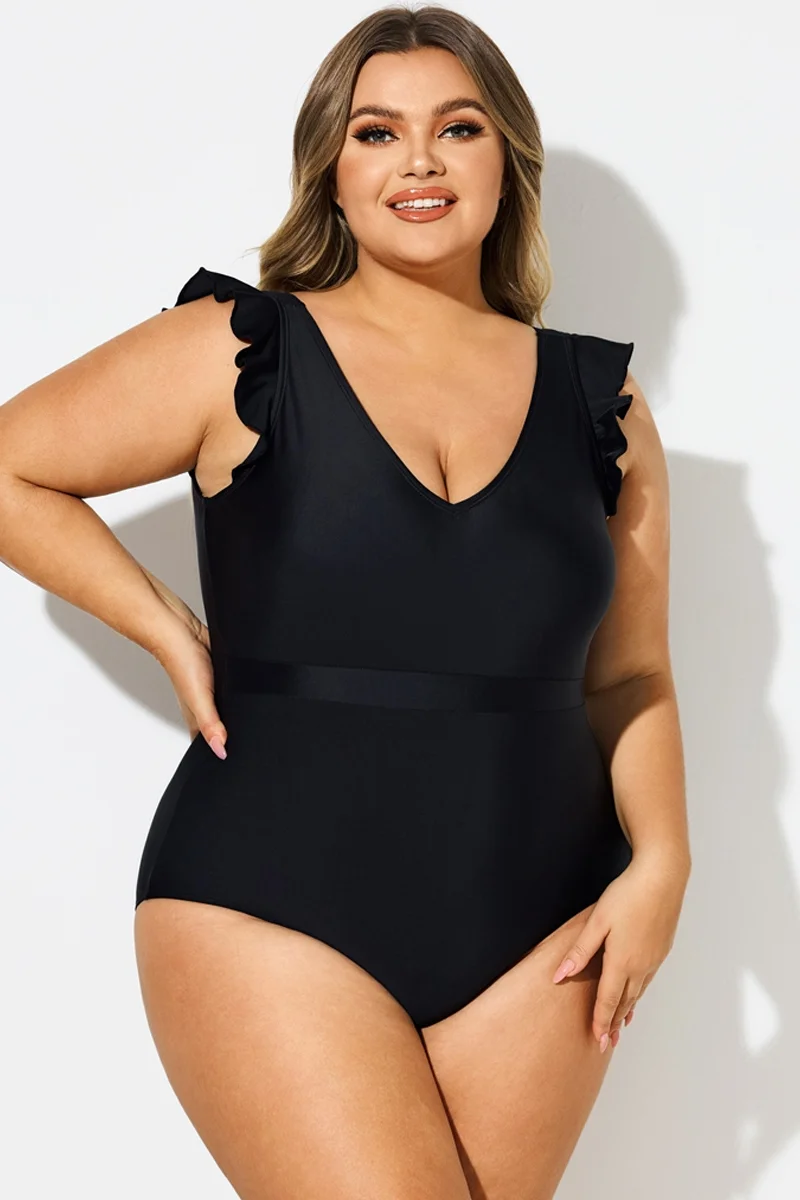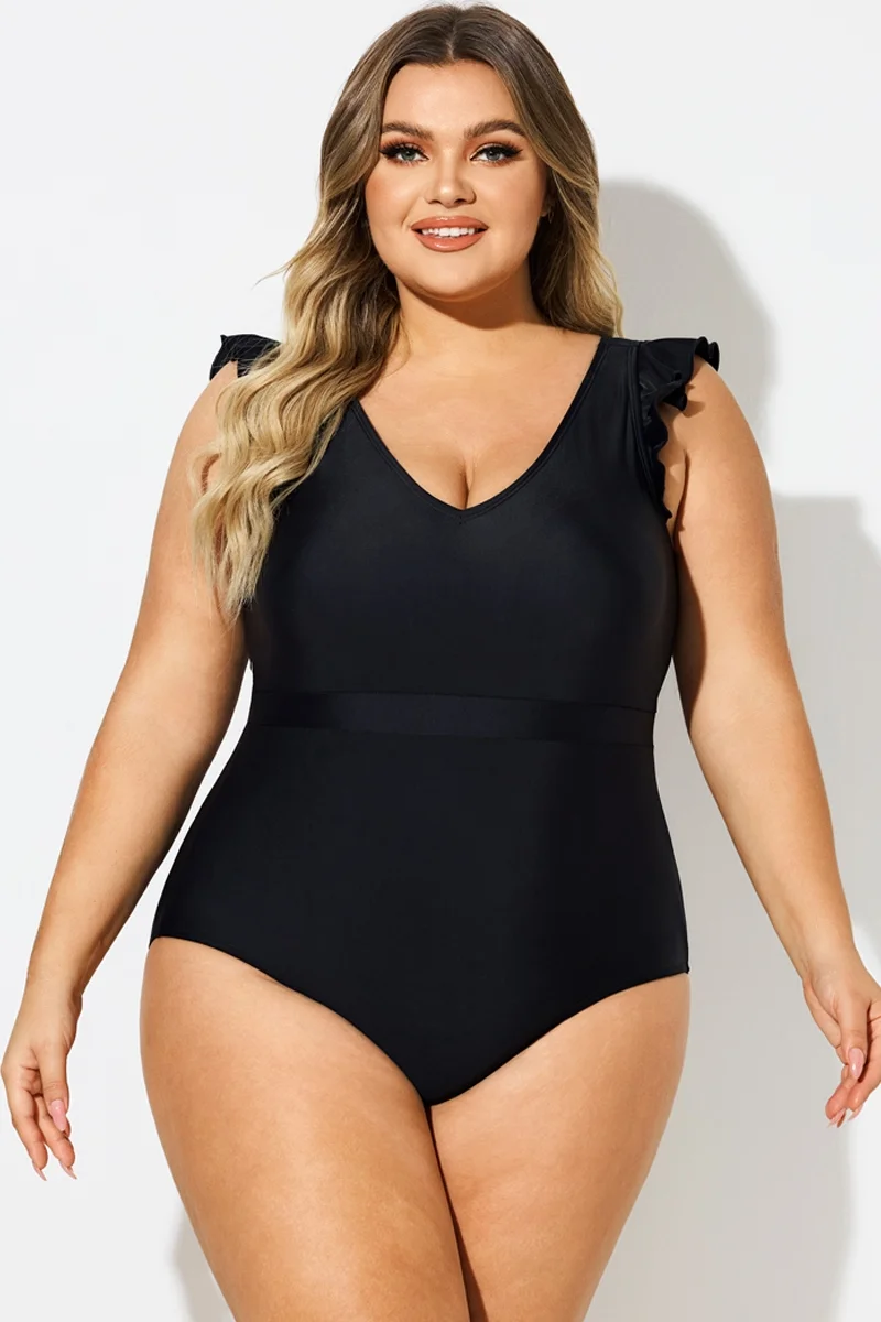 Black Ruffle Sleeves V-Neck One Piece Swimsuit - PremCurve