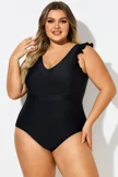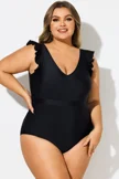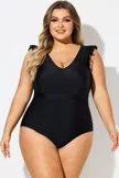 Black Ruffle Sleeves V-Neck One Piece Swimsuit