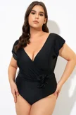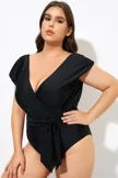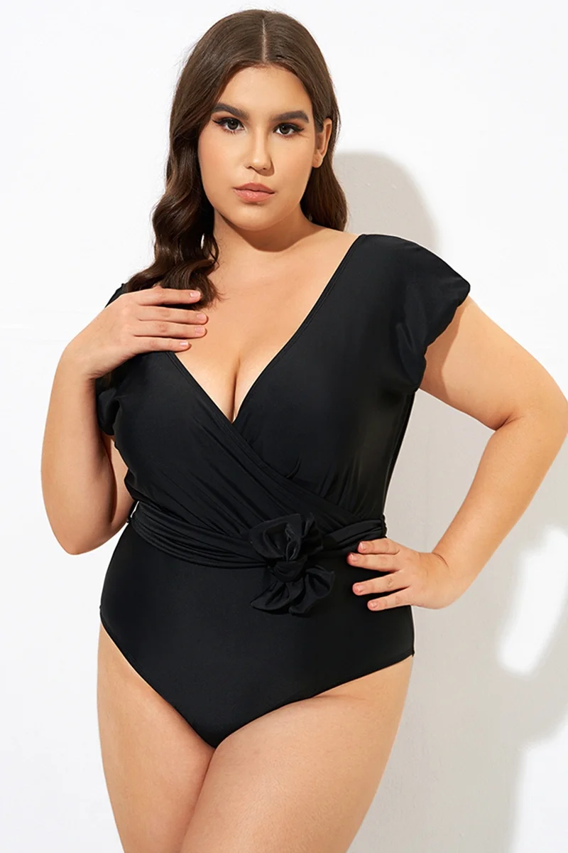 Black Short Sleeve Waist Tie One Piece Swimsuit - PremCurve