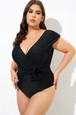 Black Short Sleeve Waist Tie One Piece Swimsuit