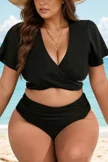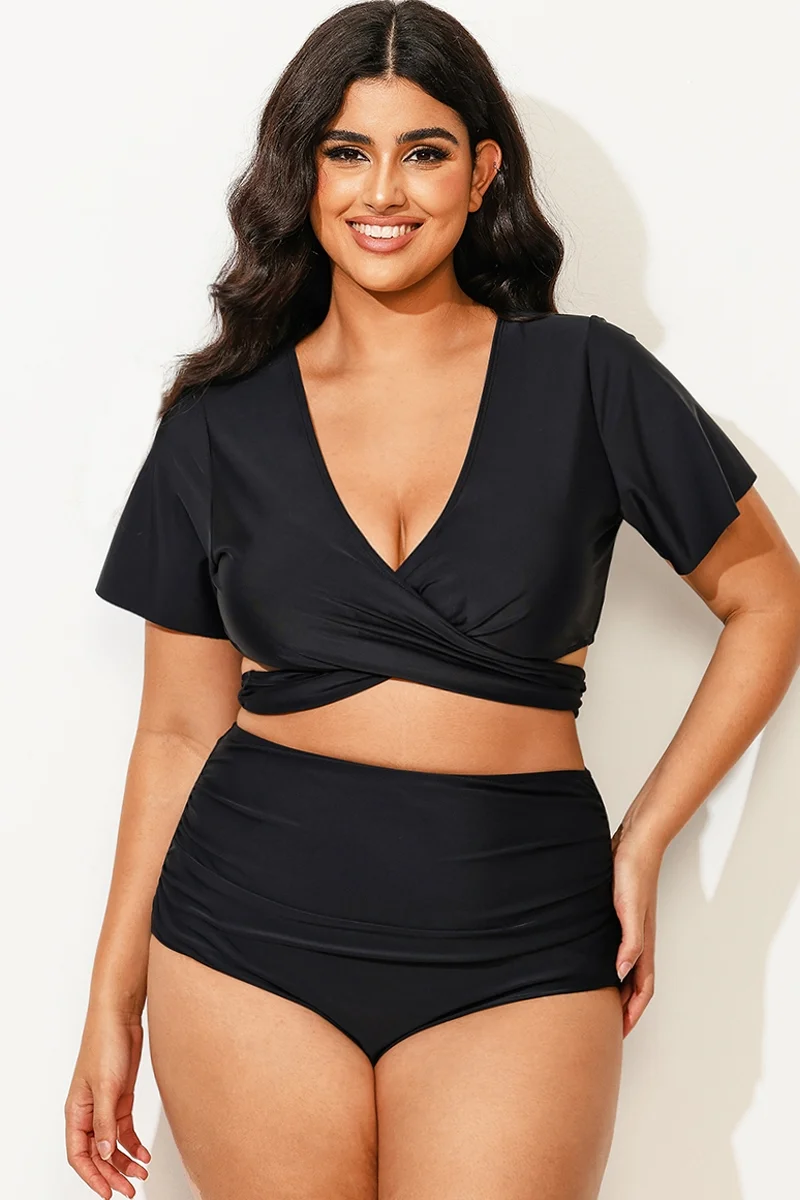 Plus Size Round Neck Black Patchwork Bikini Top
