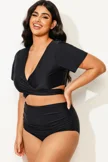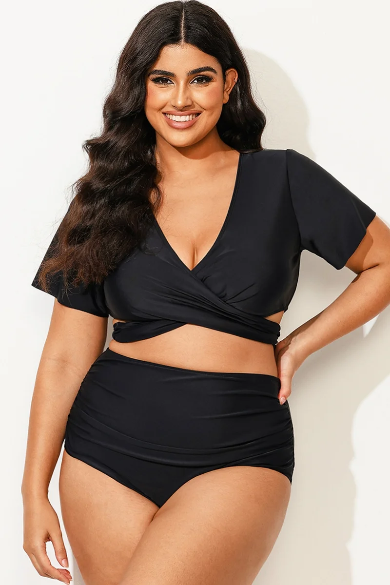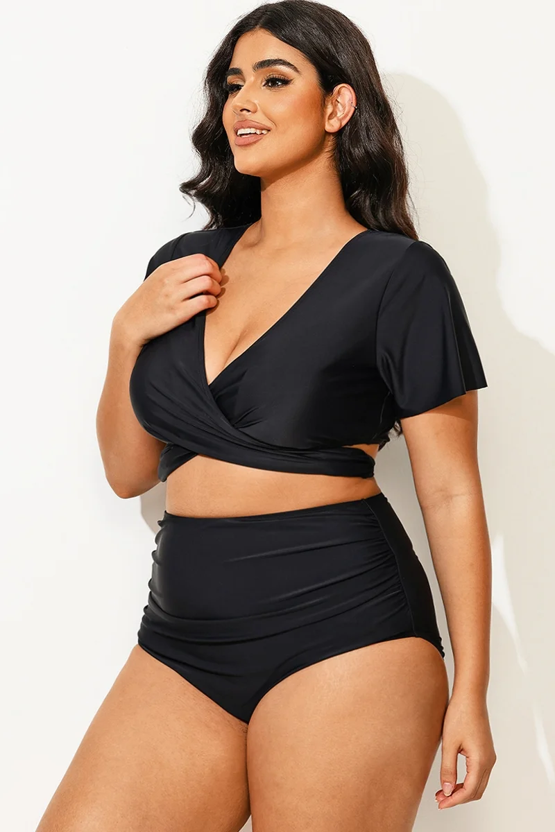Black Solid V-Neck Ruched Bikini Top - PremCurve