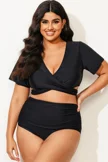 Black Solid V-Neck Ruched Bikini Top