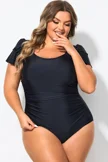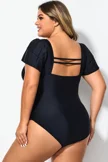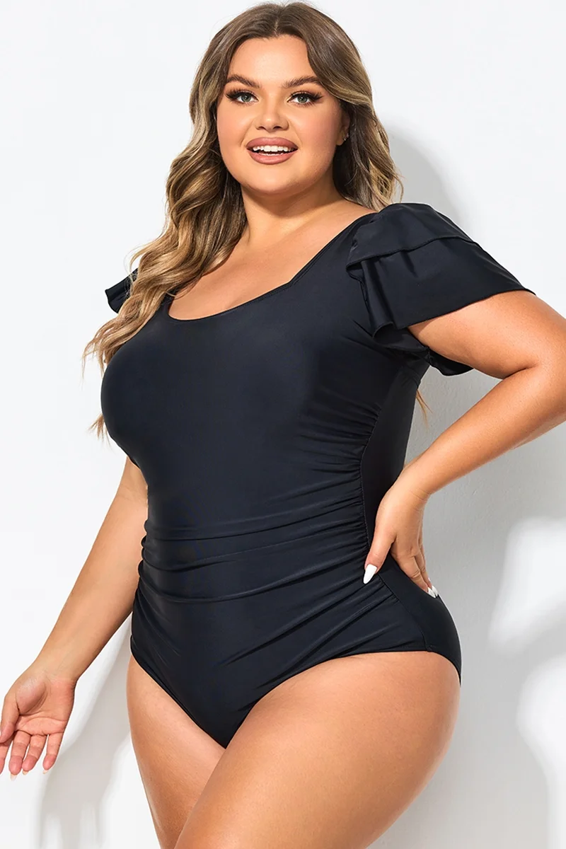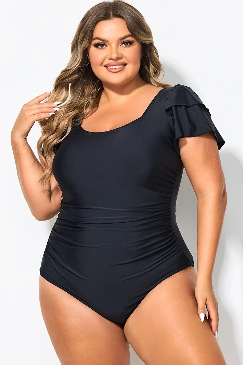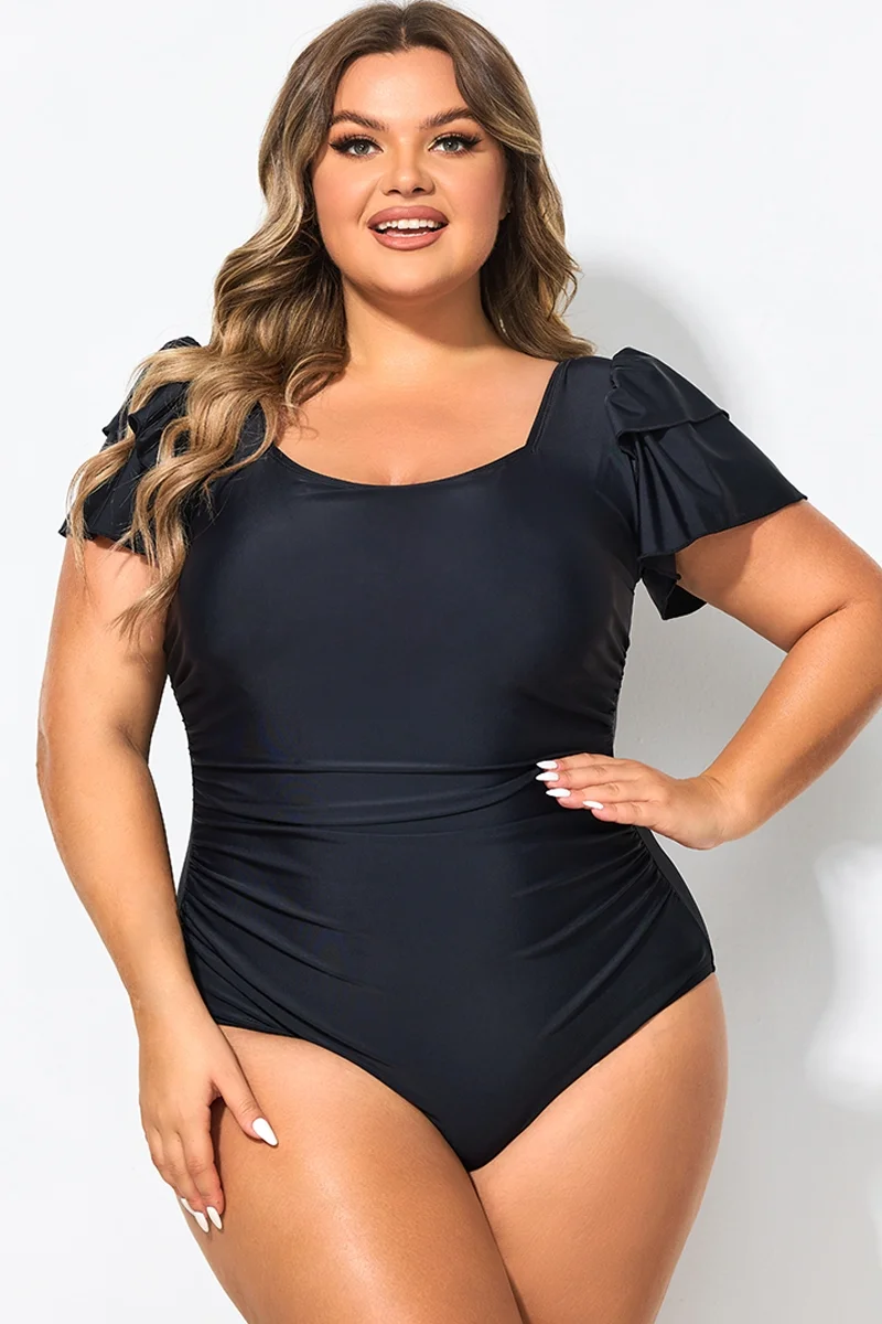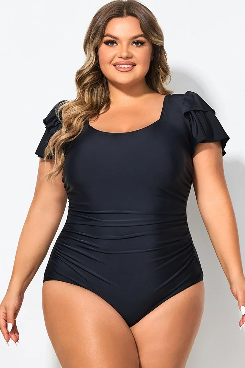 Black Square Neck Double Ruffle Sleeve One Piece Swimsuit