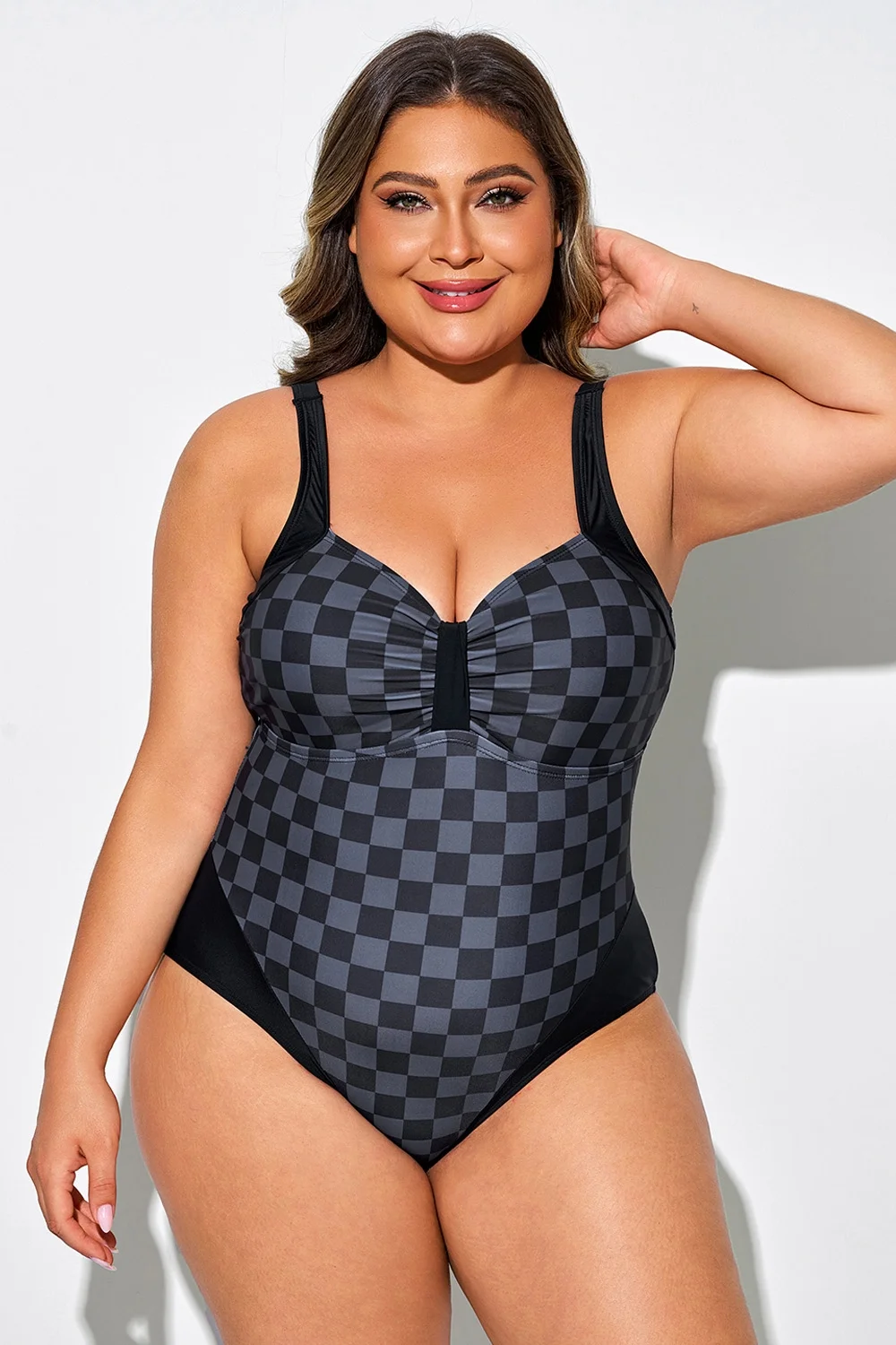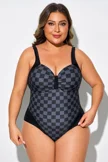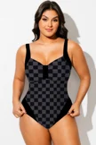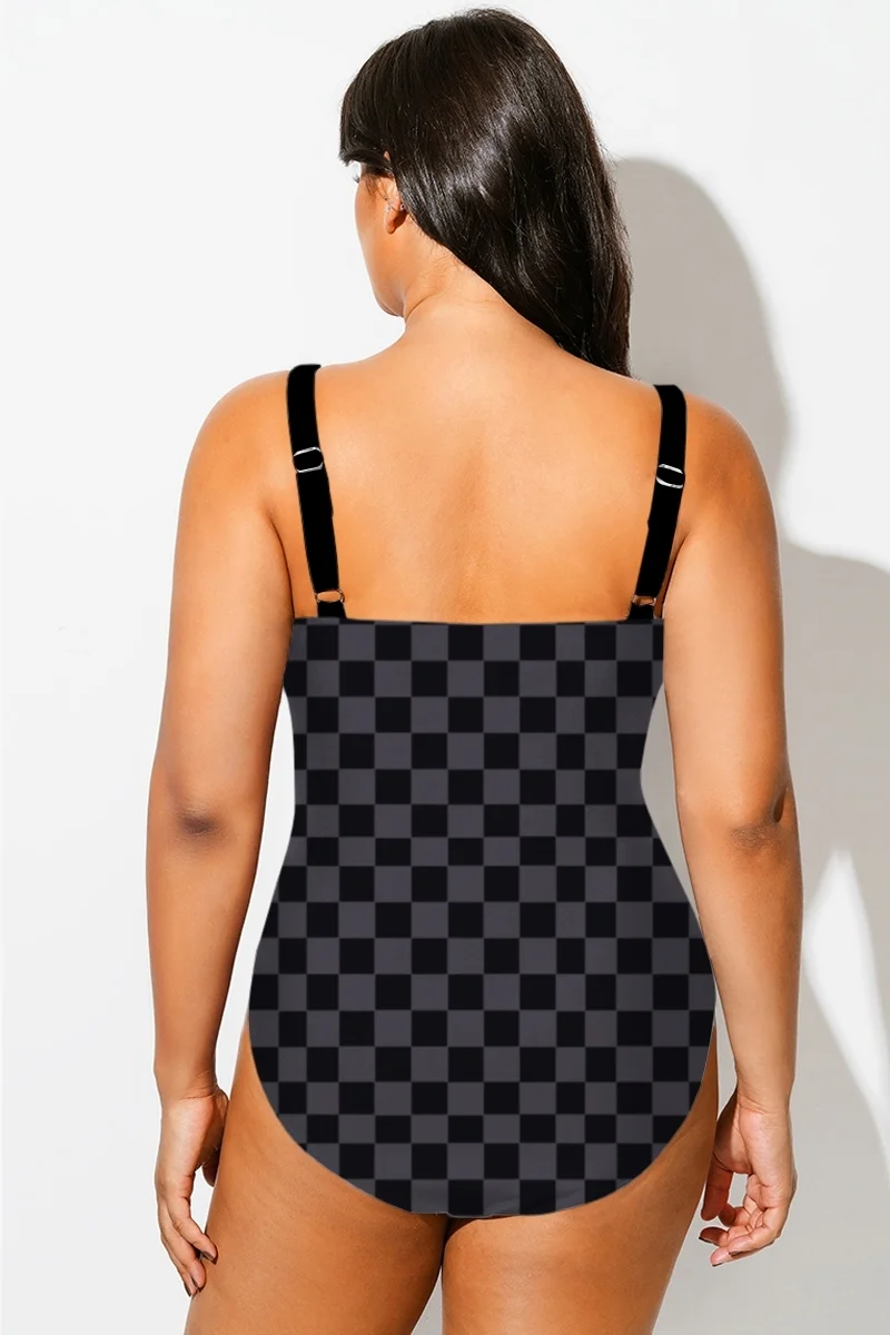 Black Squares Print V-Neck One Piece Swimsuit - PremCurve