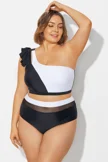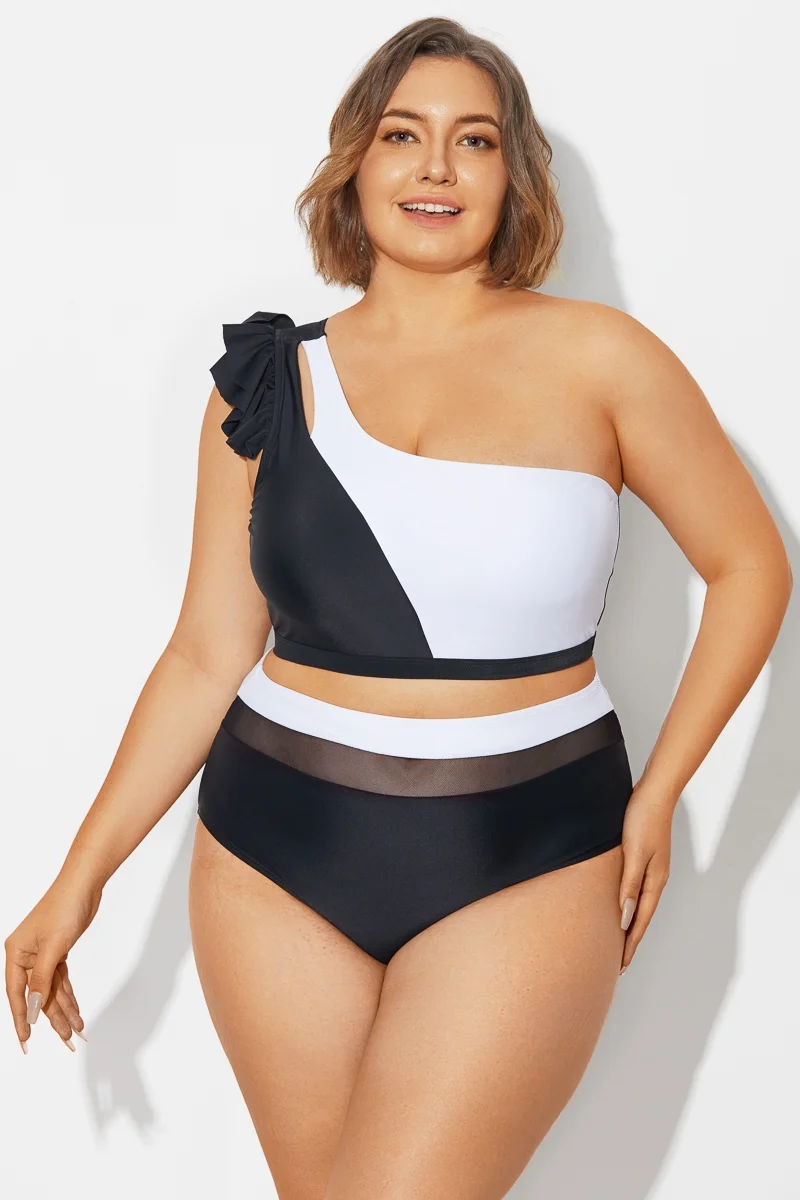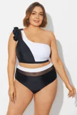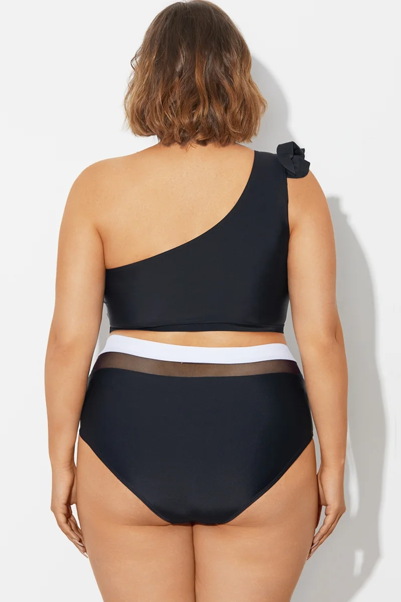 Plus Size Round Neck Black Patchwork Bikini Top