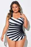 Black & White Diagonal Stripes Sarong Front One Piece Swimsuit - PremCurve