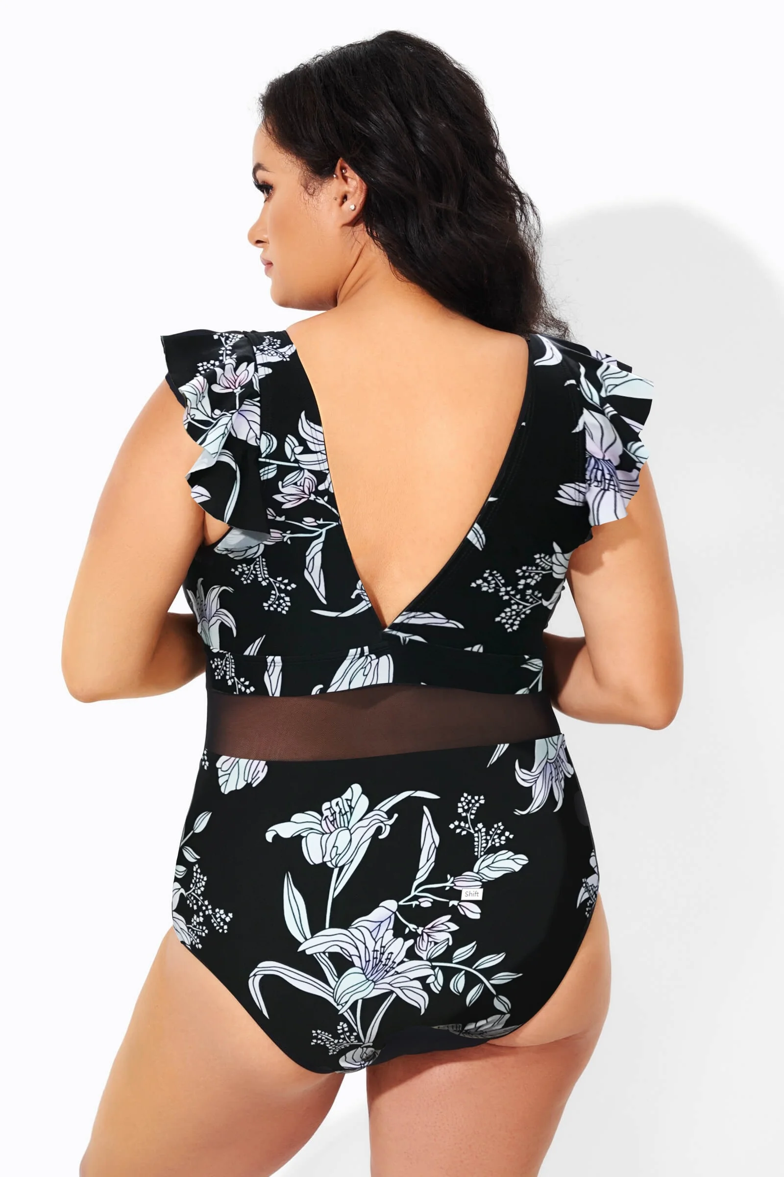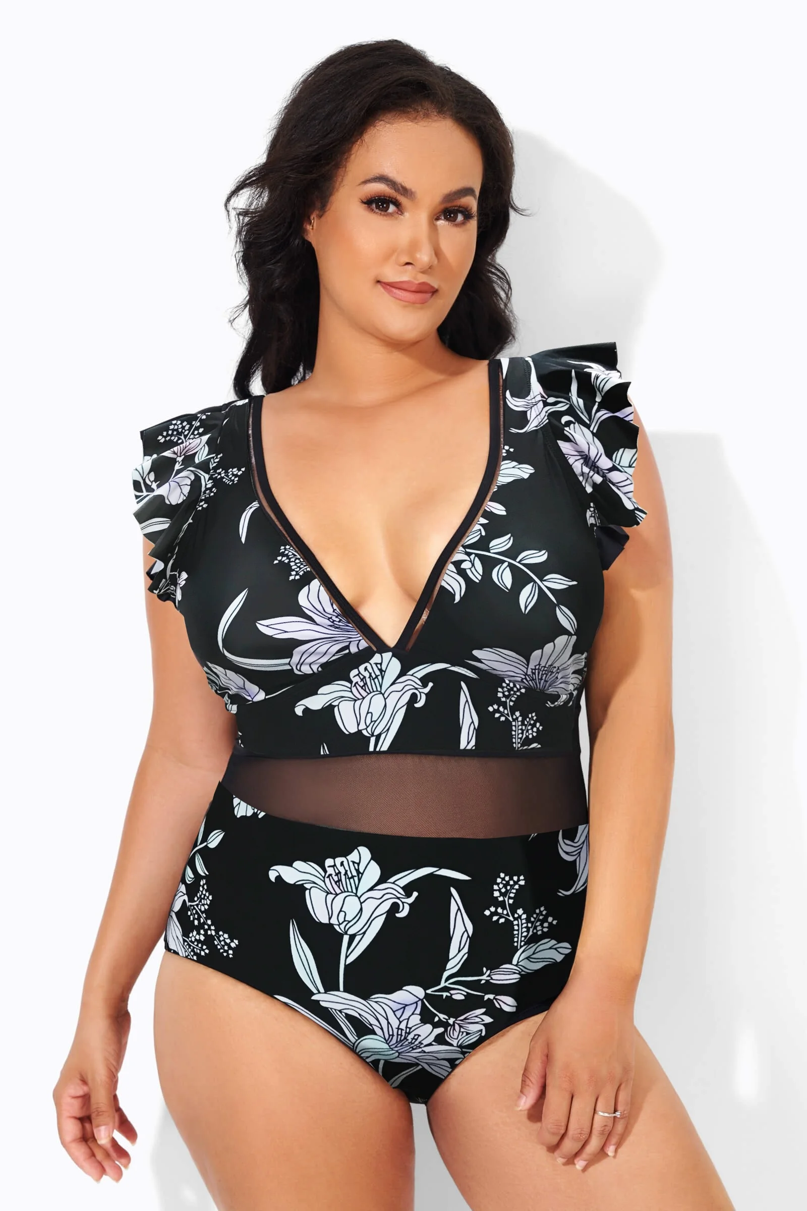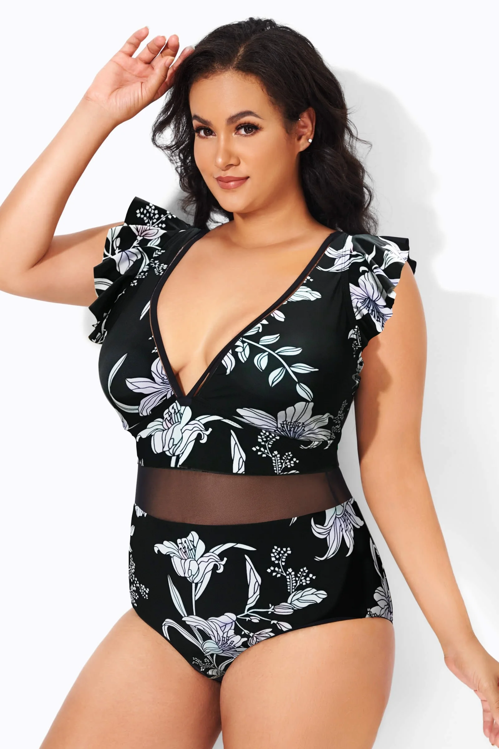 Black & White Floral Print Ruffle V-Neck One Piece Swimsuit