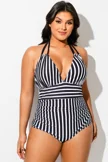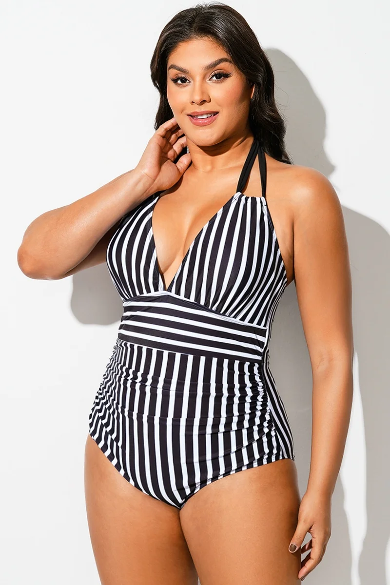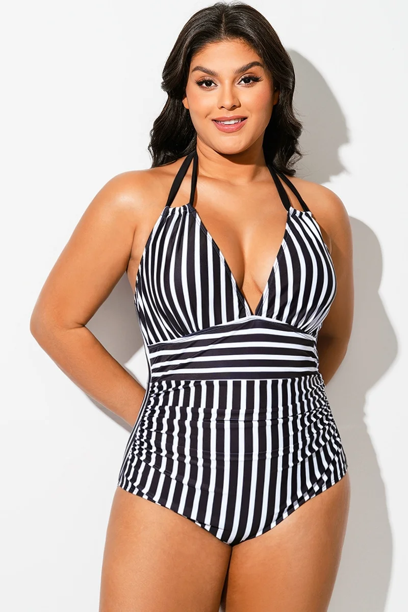 Black & White Halter Striped One Piece Swimsuit - PremCurve