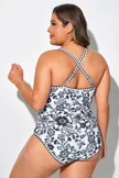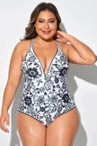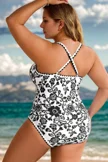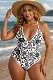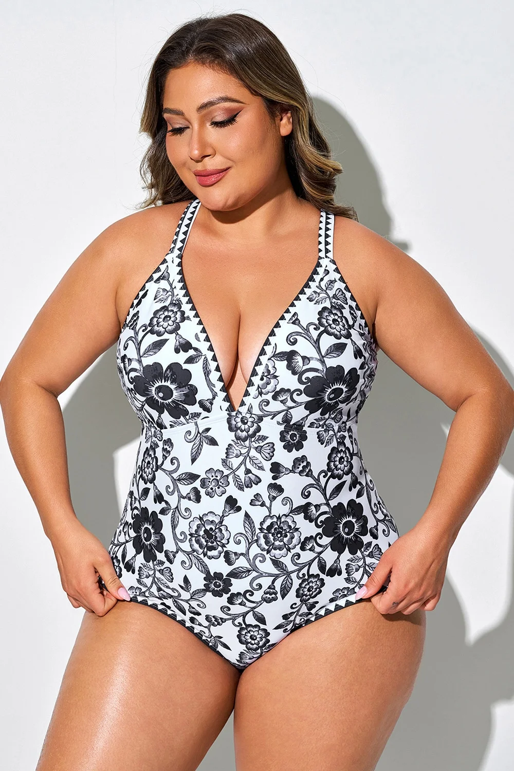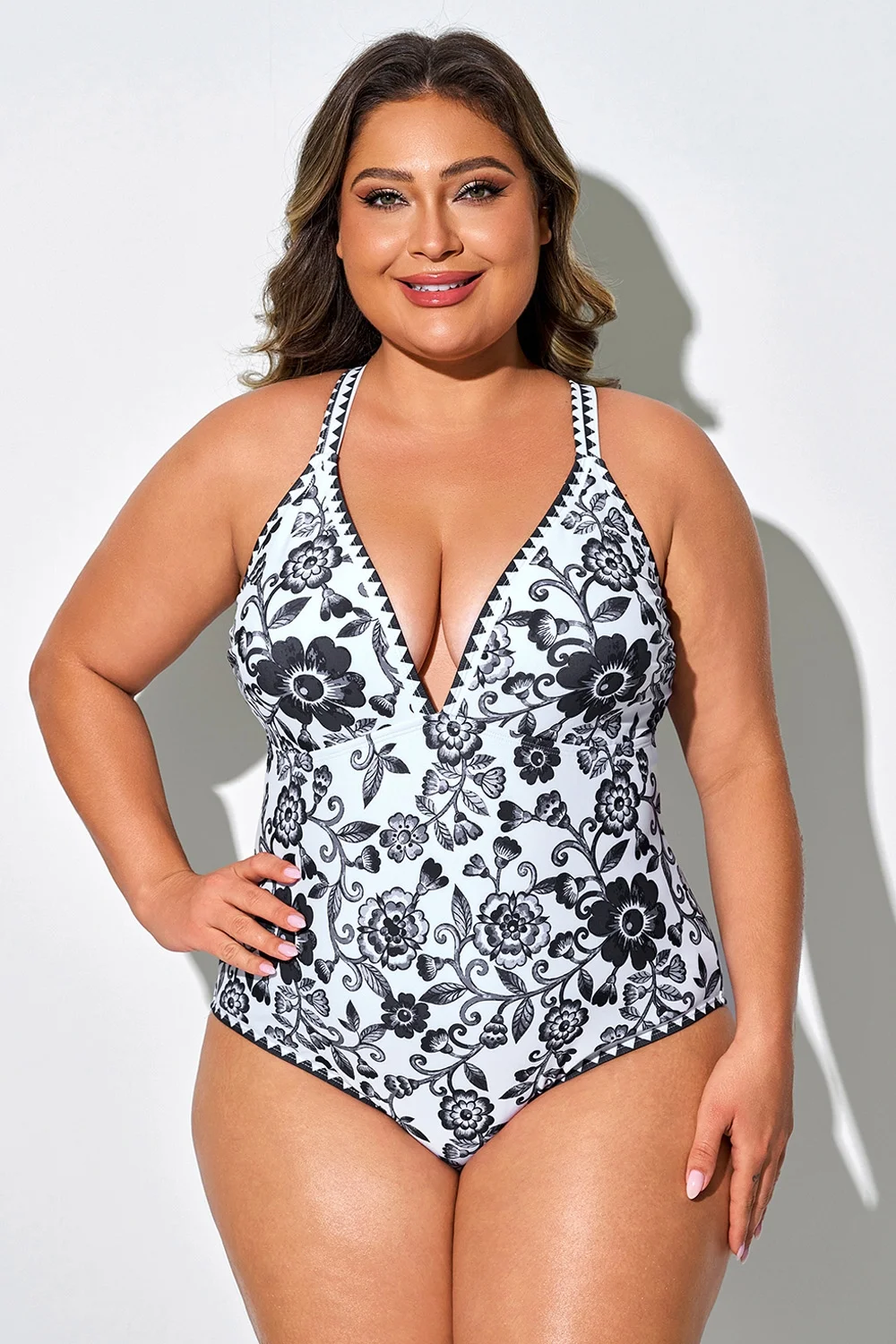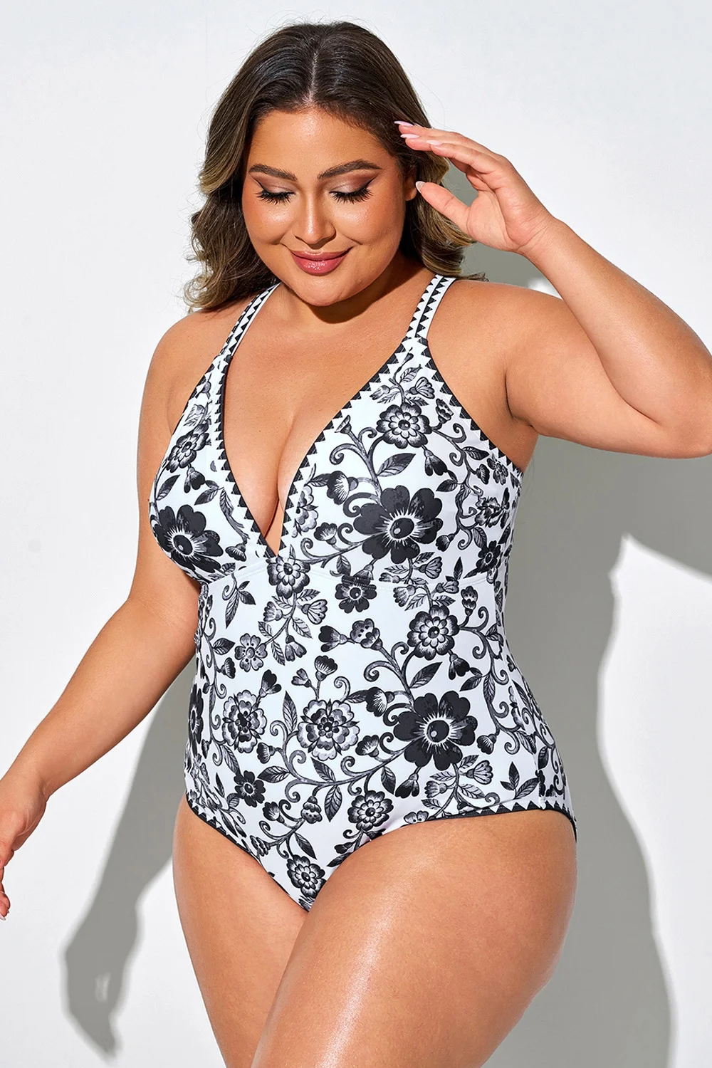 Black & White Porcelain Floral Patterned One Piece Swimsuit