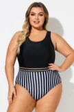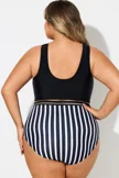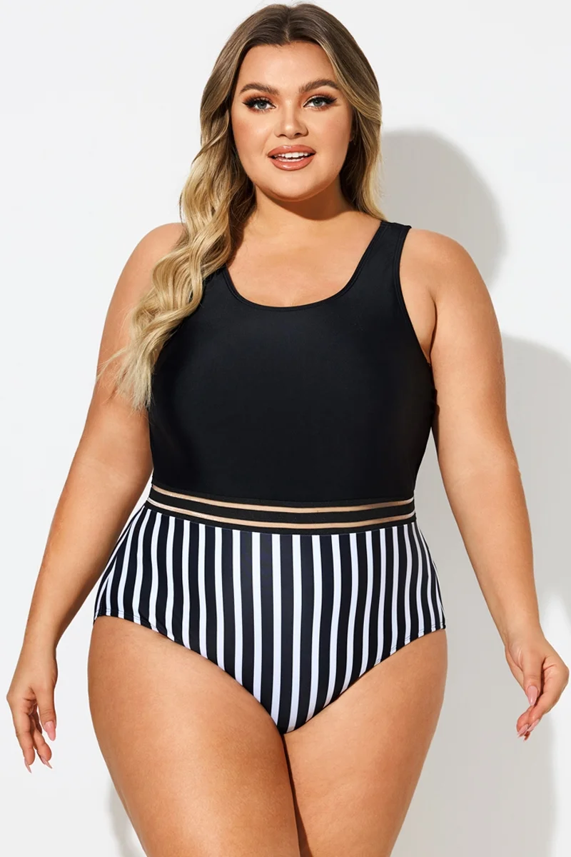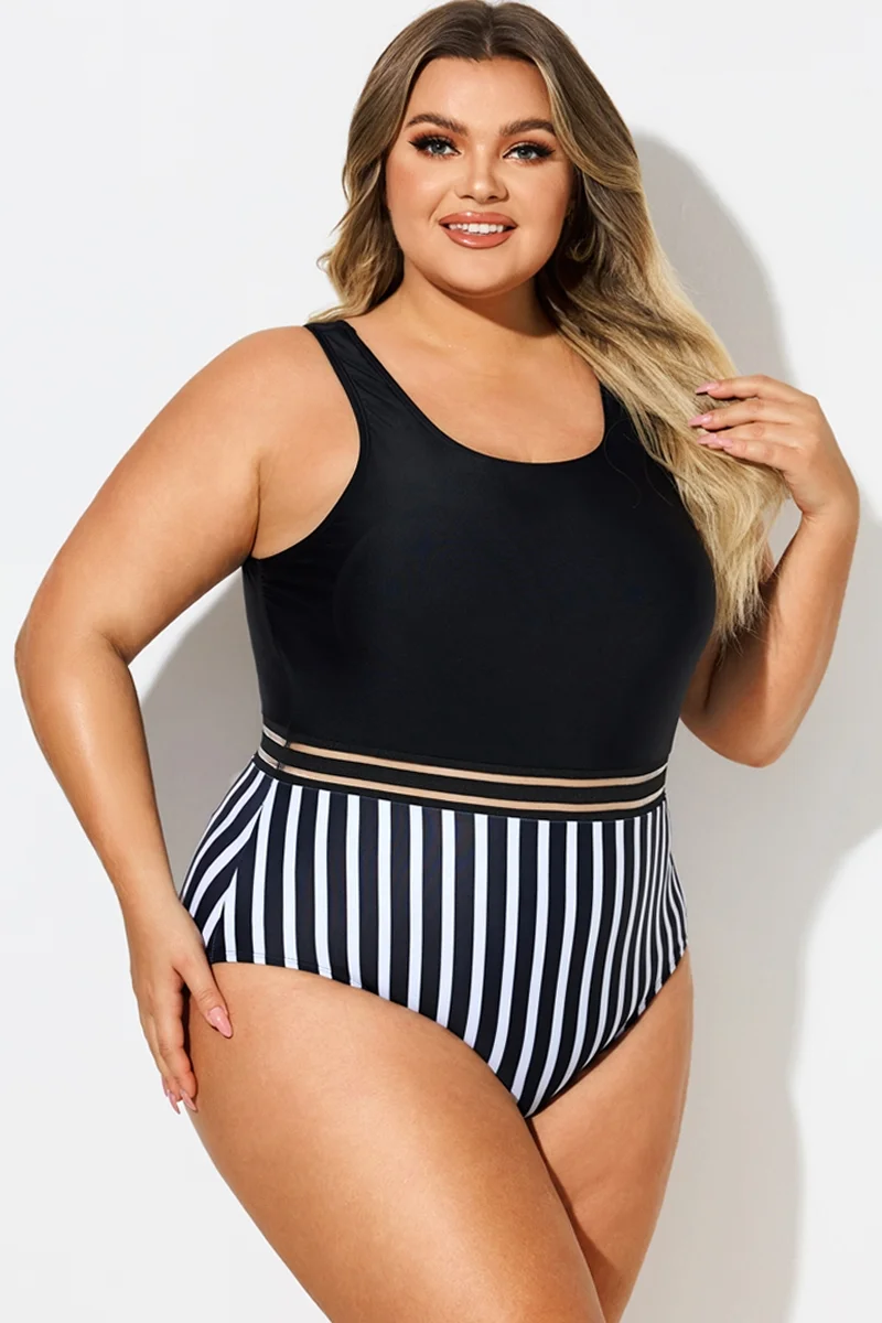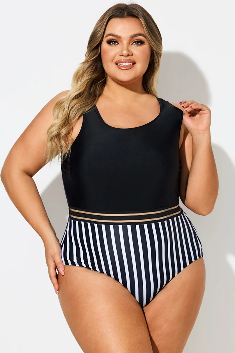 Black & White Round Neck Striped Mesh One Piece Swimsuit - PremCurve