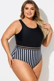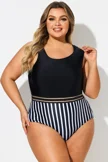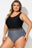 Black & White Round Neck Striped Mesh One Piece Swimsuit