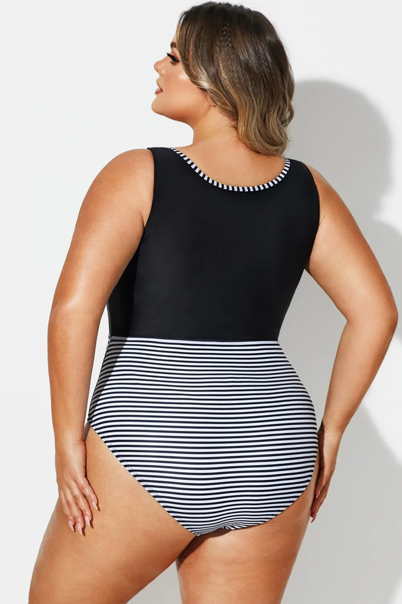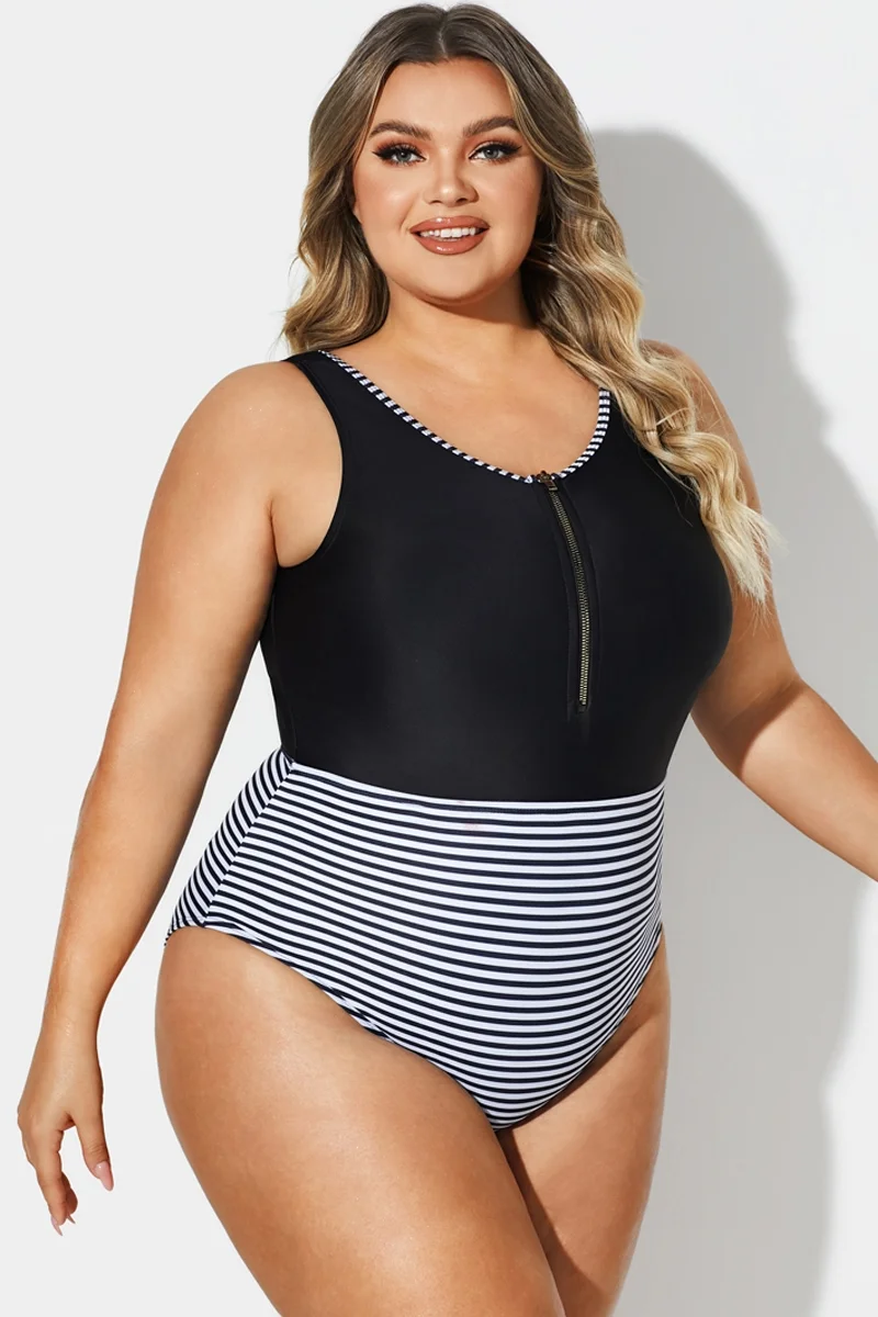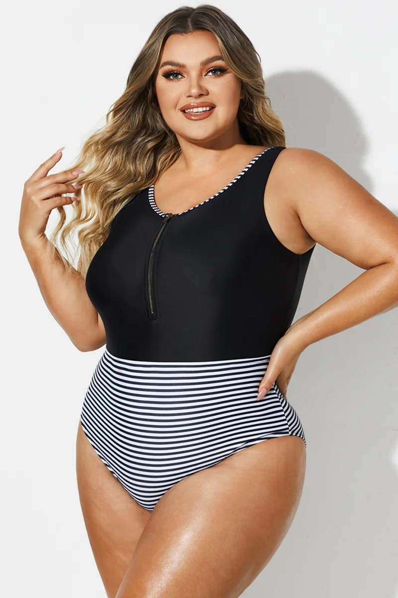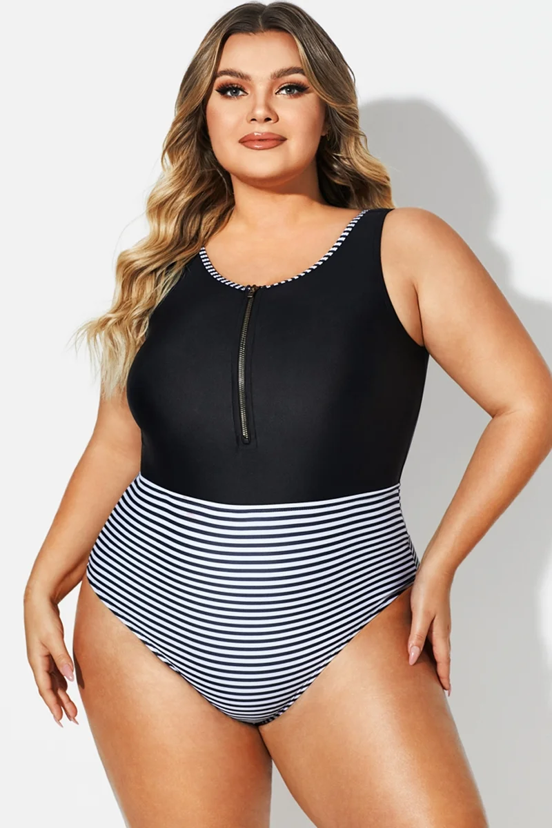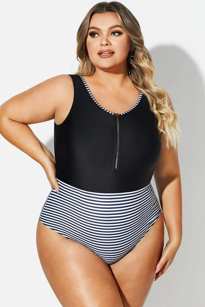 Black & White Striped Front Zip One Piece Swimsuit -PremCurve