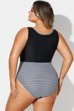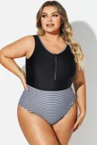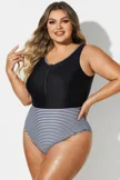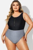 Black & White Striped Front Zip One Piece Swimsuit