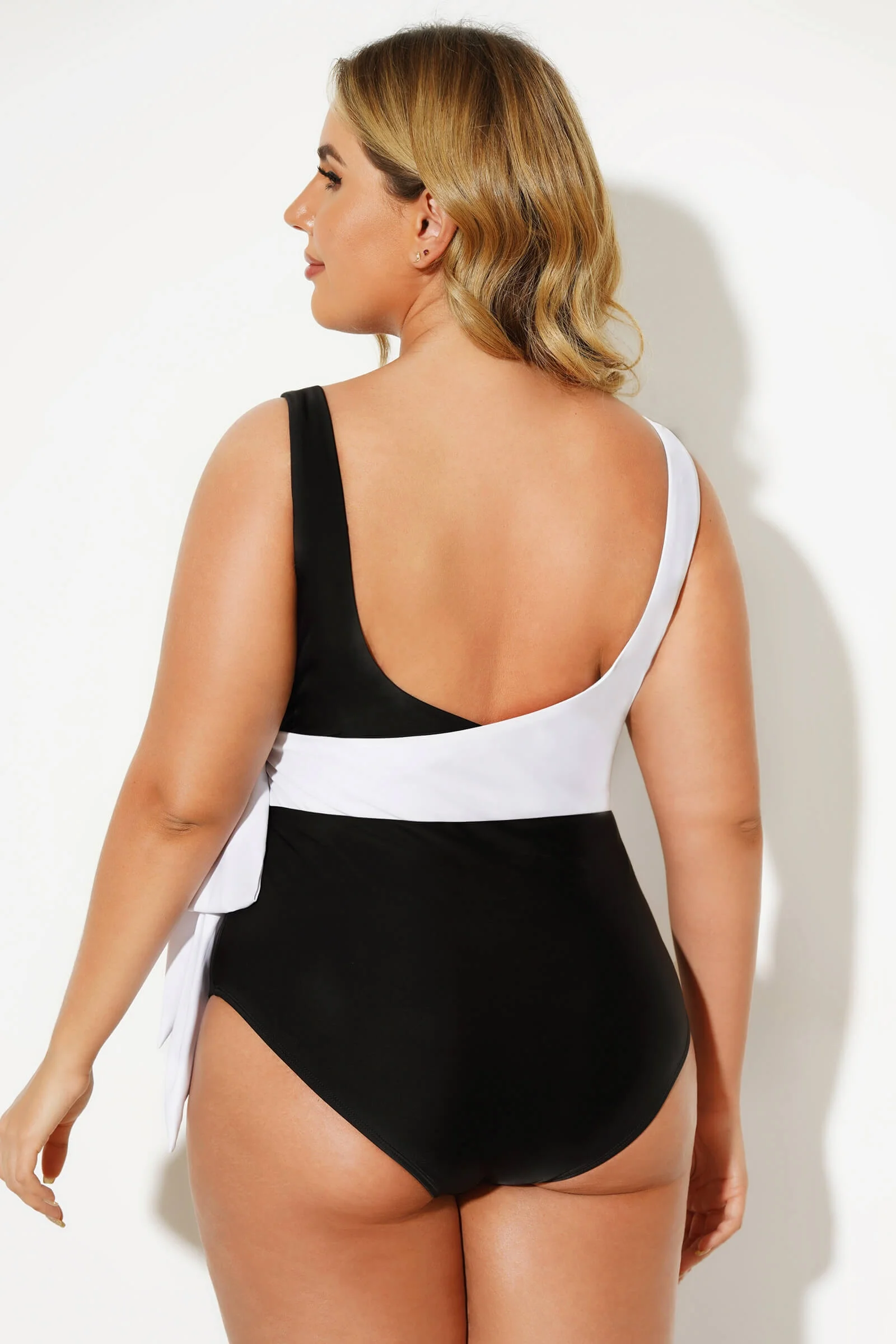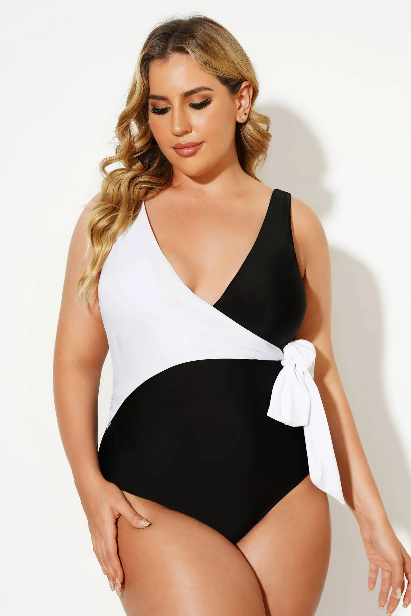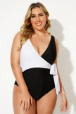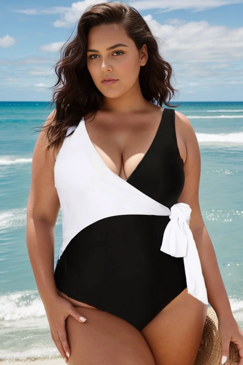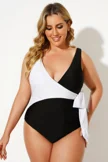 Black & White V-neck Tie Wrap One Piece Swimsuit