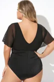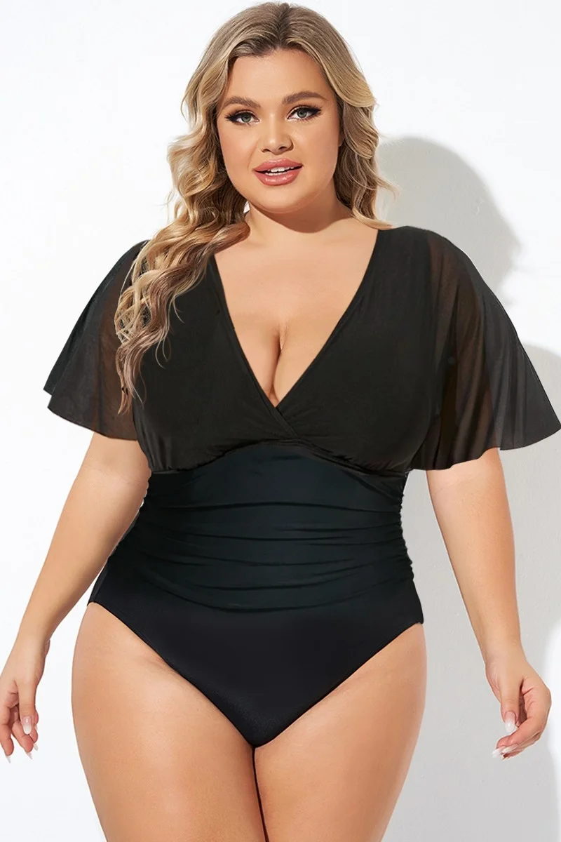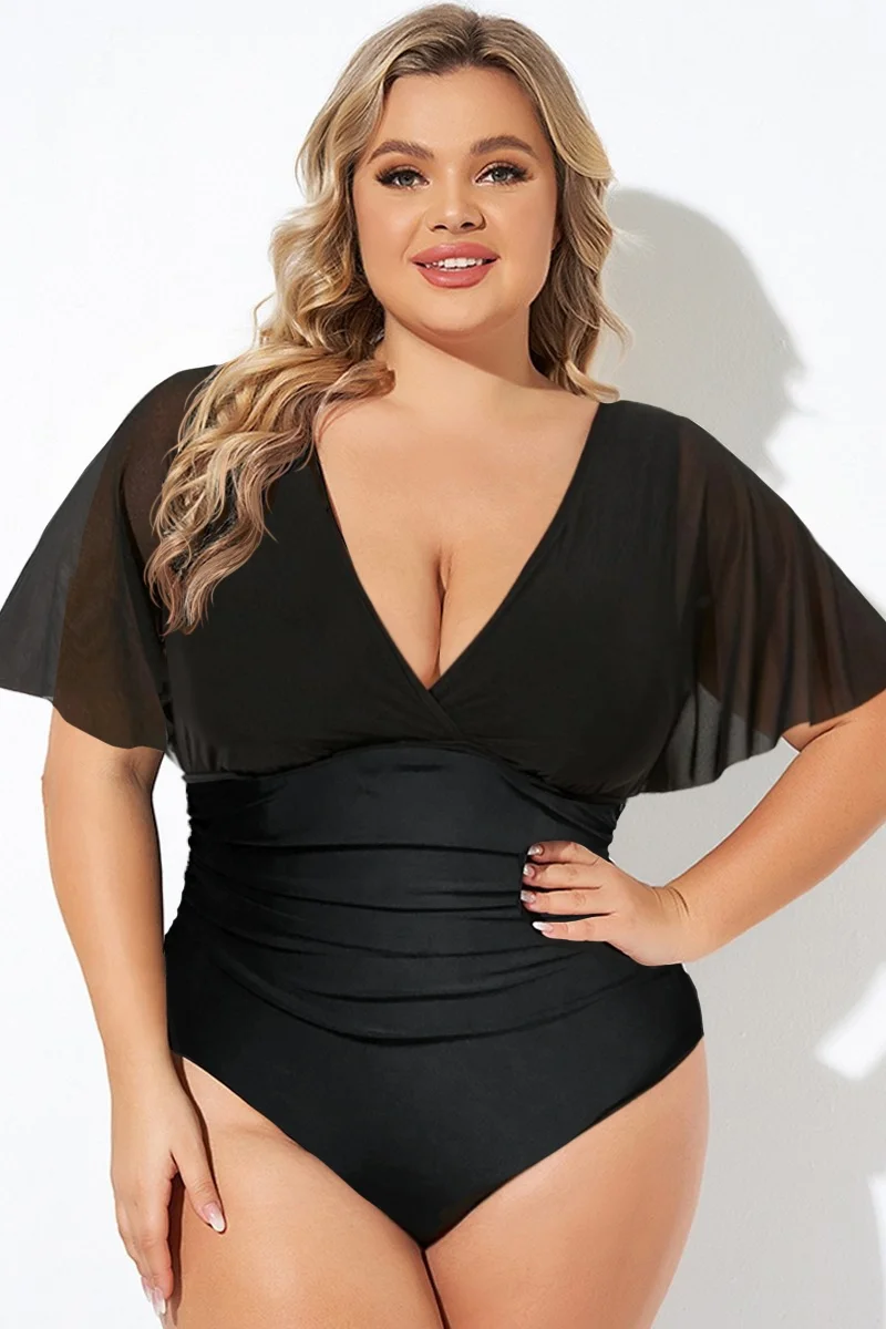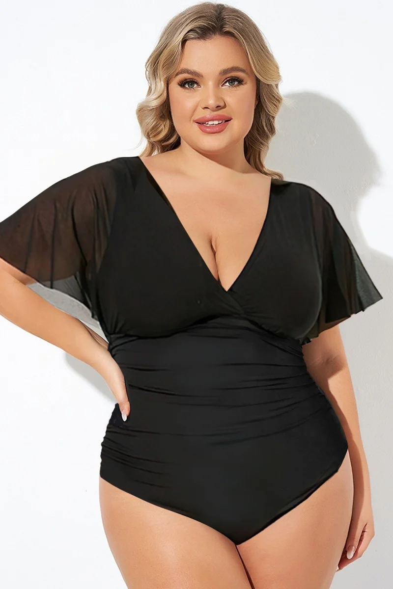 Black Wireless Mesh Flutter Sleeve One Piece Swimsuit - PremCurve