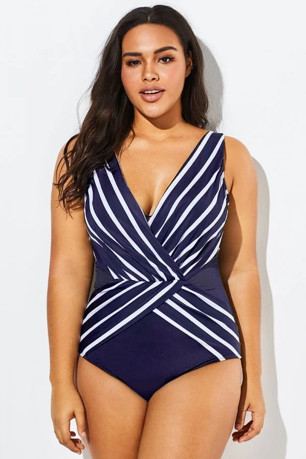 Blue and White Stripe Mesh One Piece Swimsuit  - PremCurve