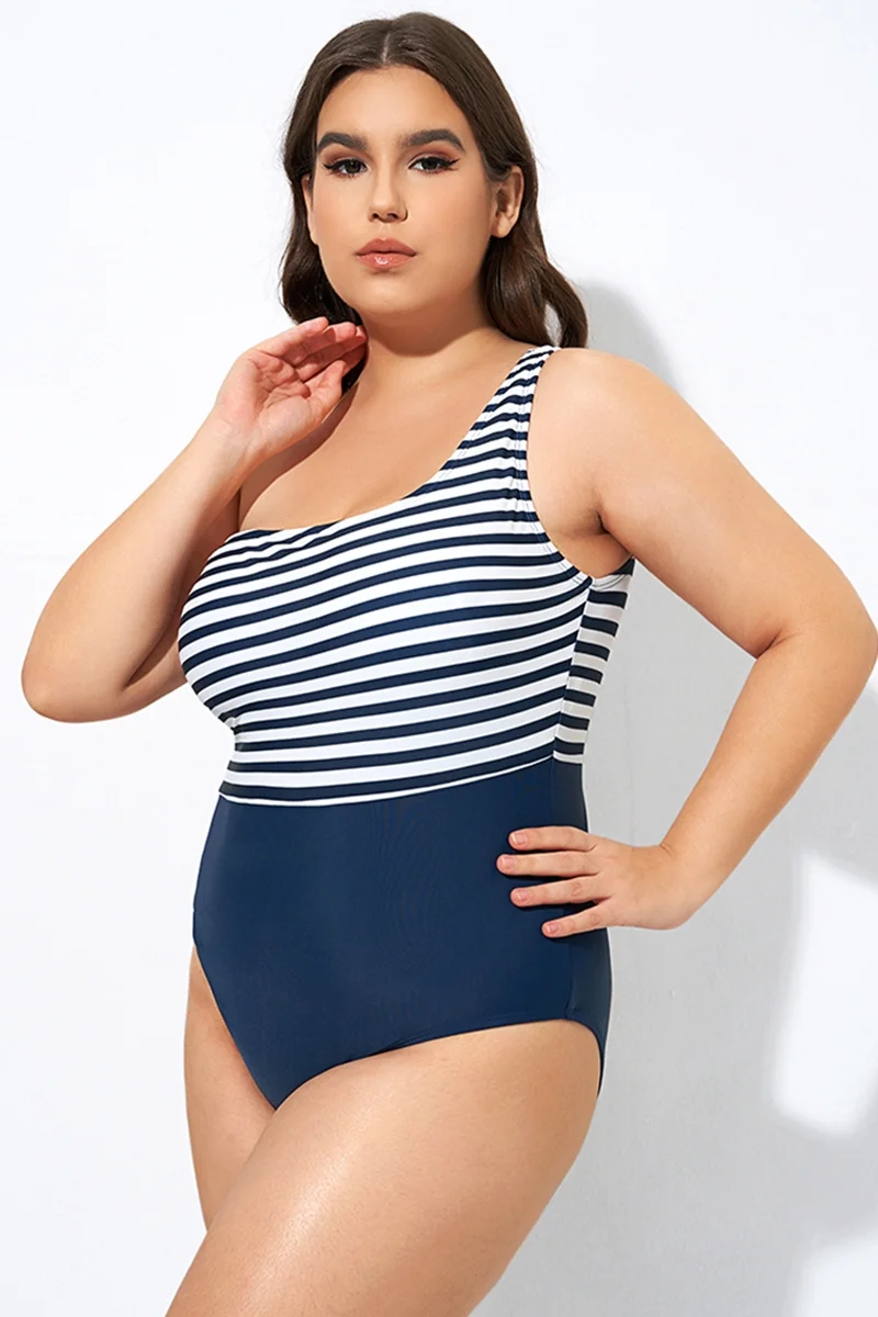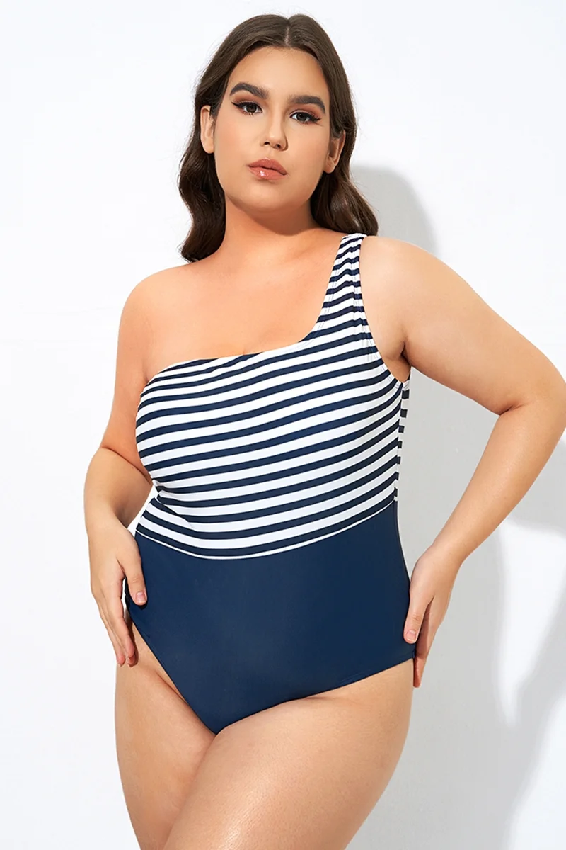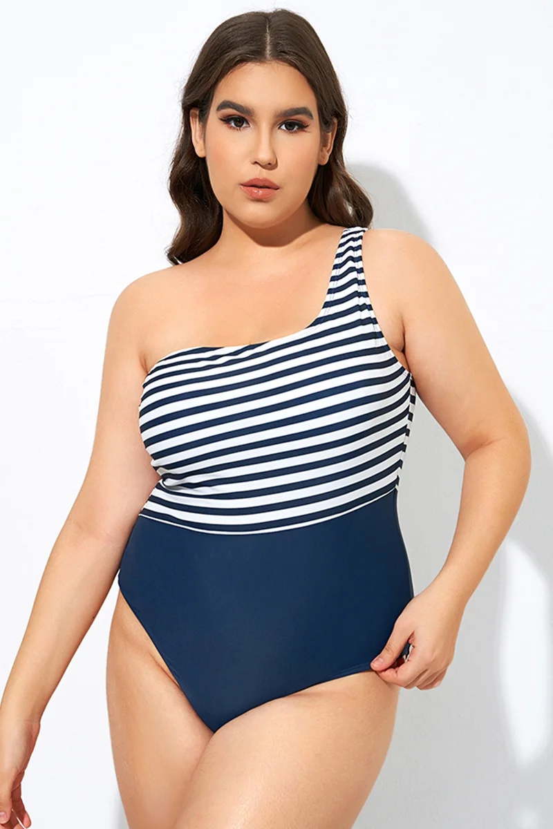 Blue and White Stripe One Shoulder One Piece Swimsuit
