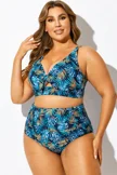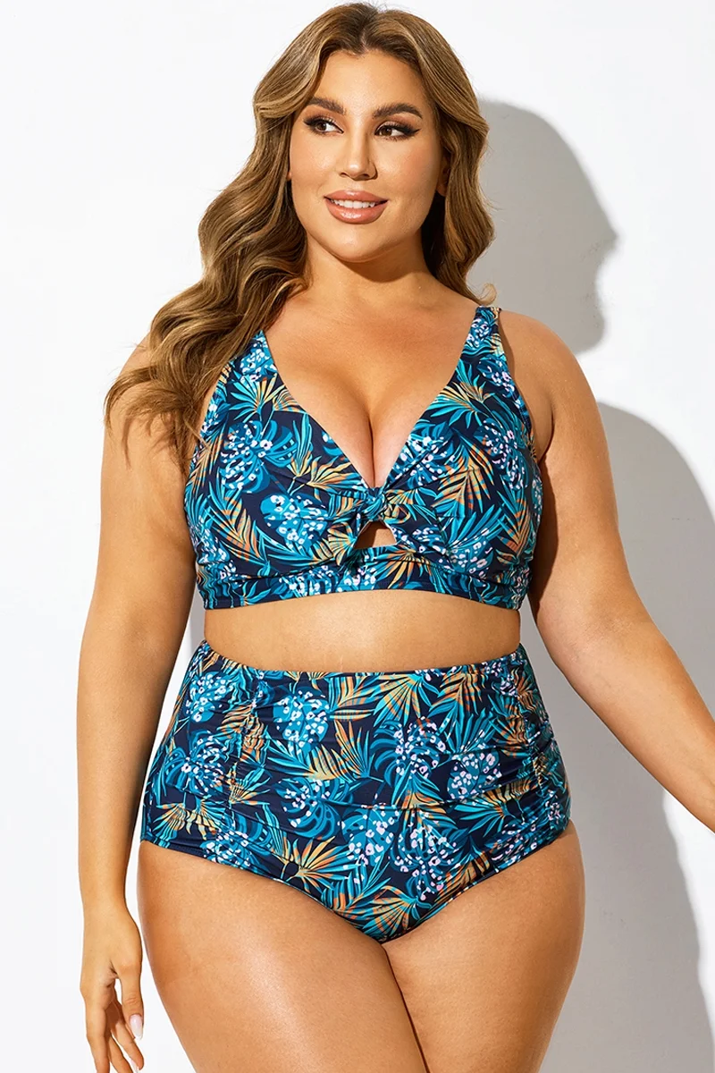Blue Floral Print Knot Ruched Bikini Top
