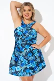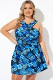 Blue Floral Printed High Neck Wrap Swimdress - PremCurve