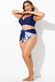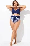 Plus Size Round Neck Black Patchwork Bikini Top