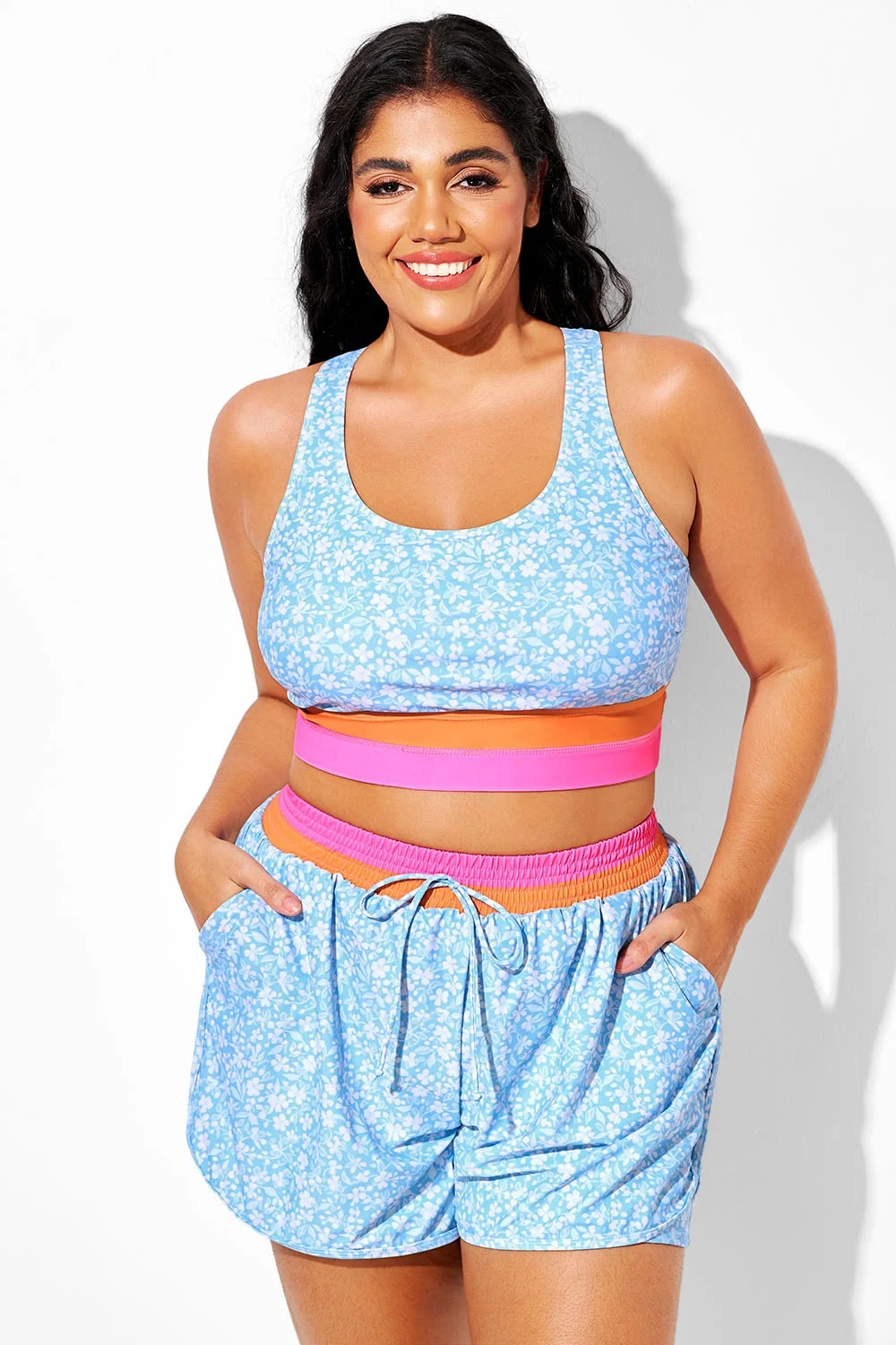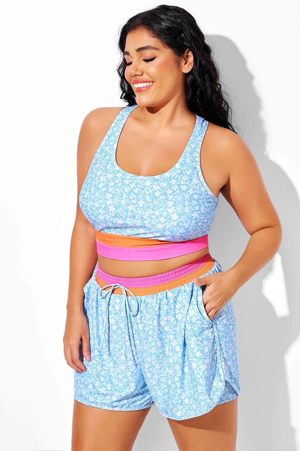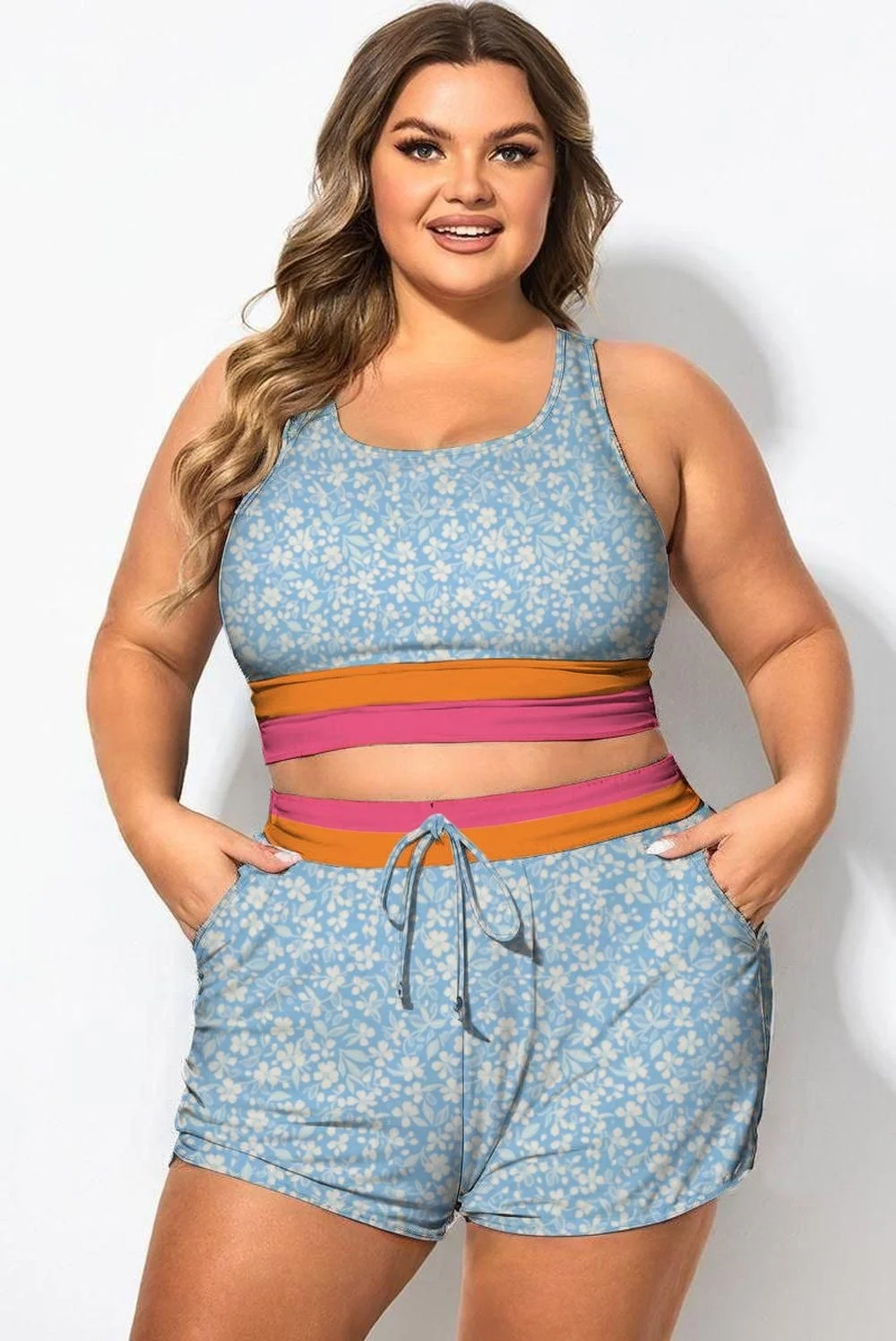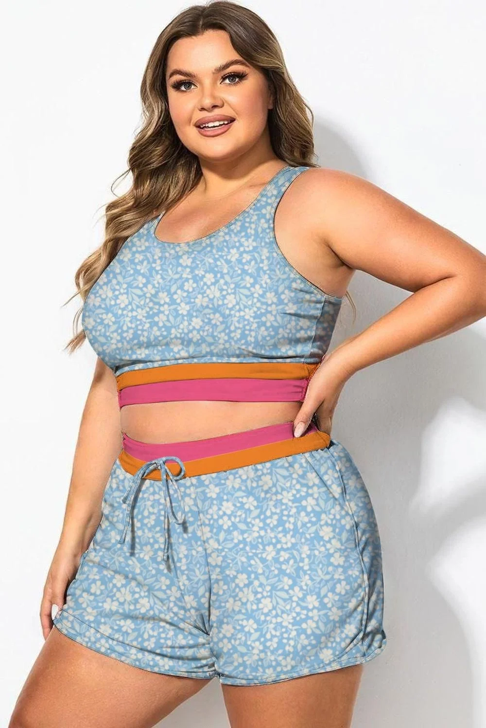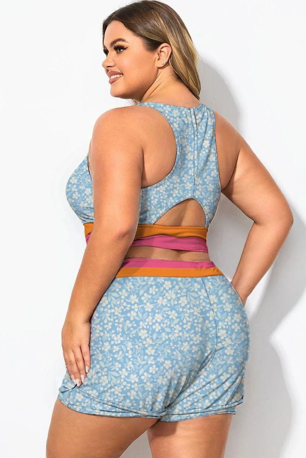 Blue Floral Round Neck Patchwork Bikini Top - PremCurve