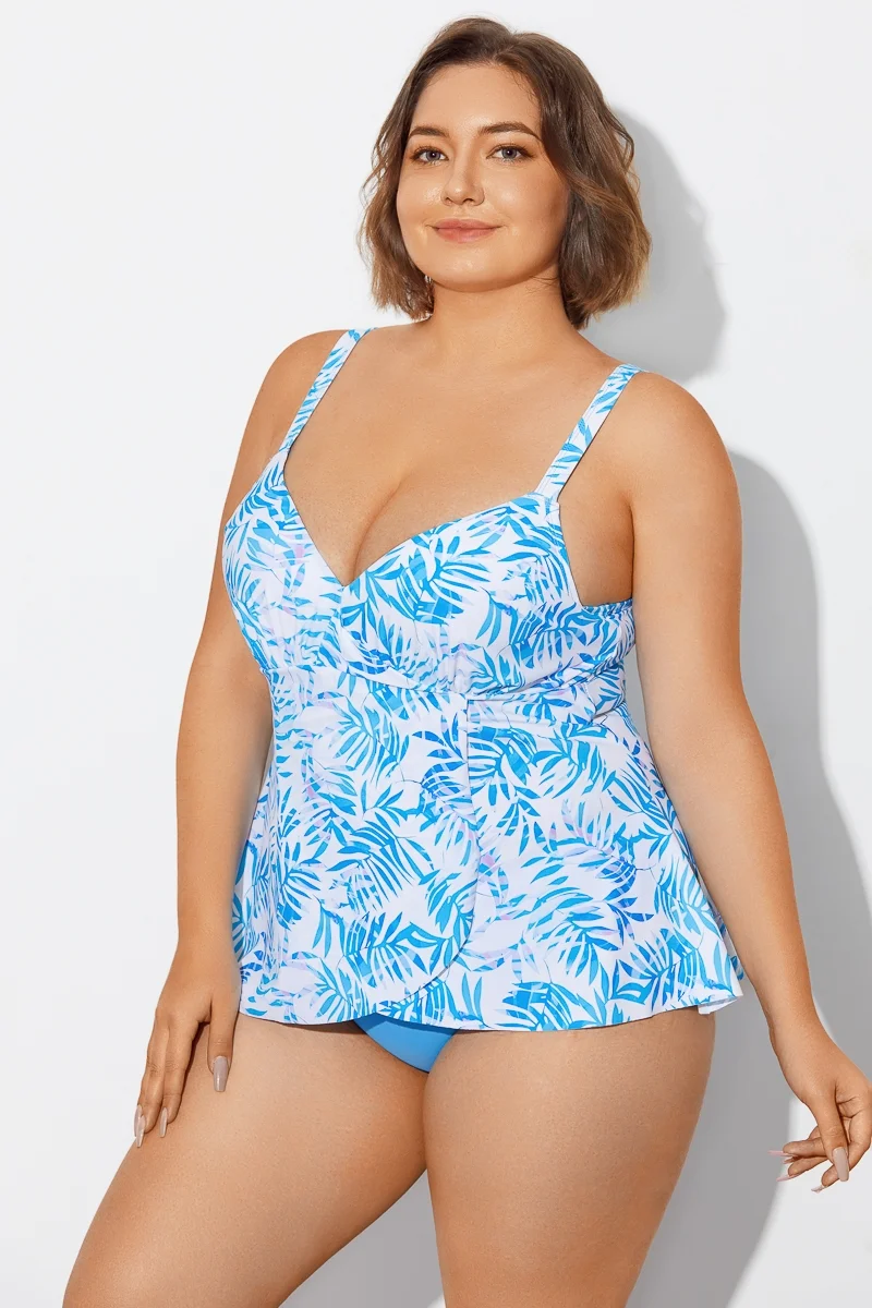 Blue Purple Palm Faux Flyaway Underwire Tankini Top - PremCurve