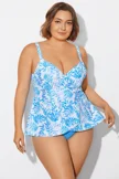 Blue Purple Palm Faux Flyaway Underwire Tankini Top