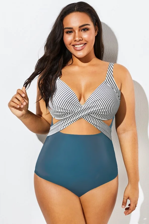 Blue Striped Underwire Cut-Out One Piece Swimsuit - PremCurve