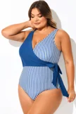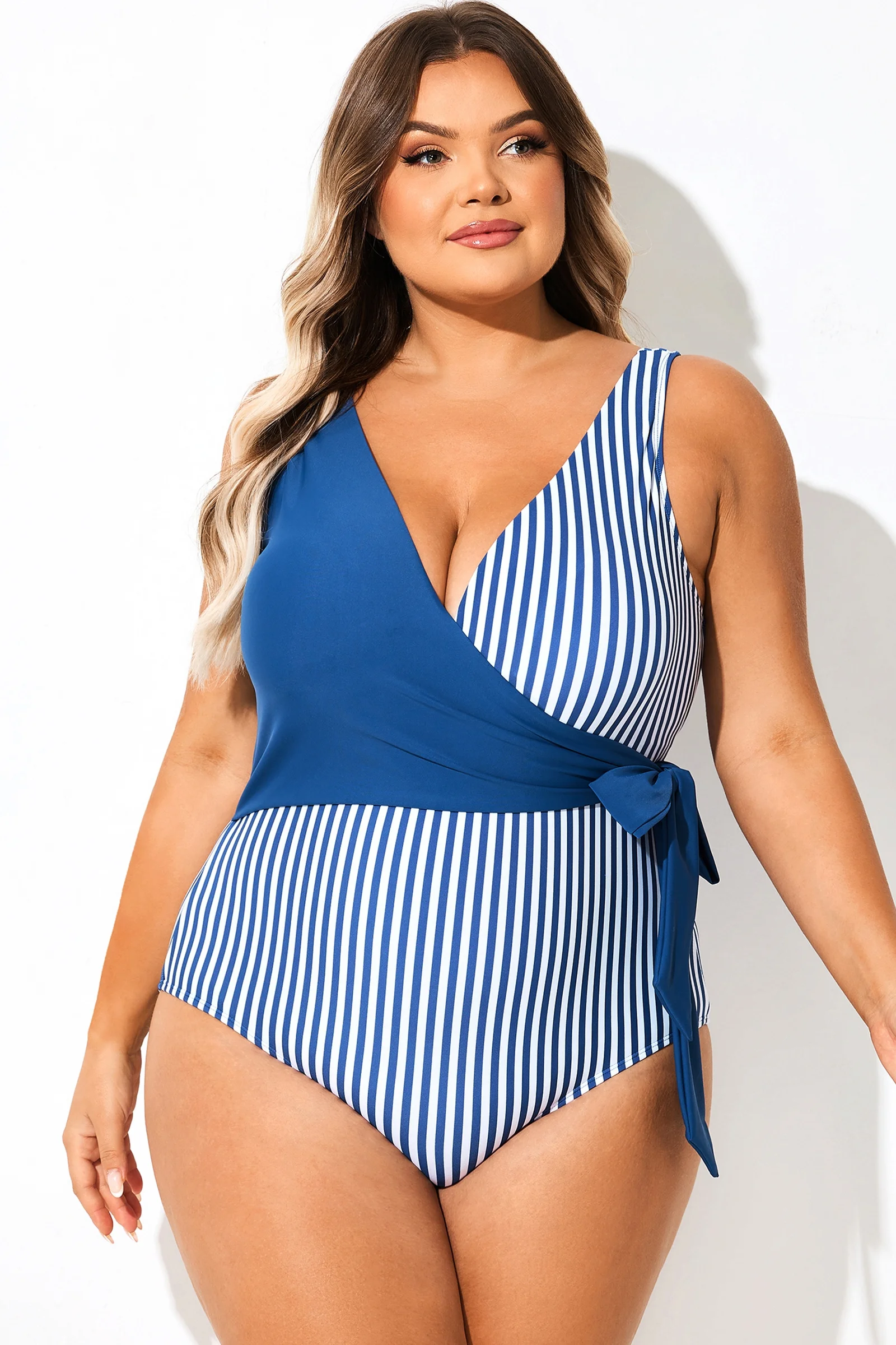 Blue V-Neck Striped One Piece Swimsuit - PremCurve