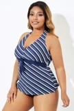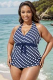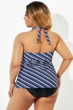 Blue & White Stripe Self-tie Halter Straps Tankini Top - PremCurve