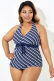 Blue & White Stripe Self-tie Halter Straps Tankini Top